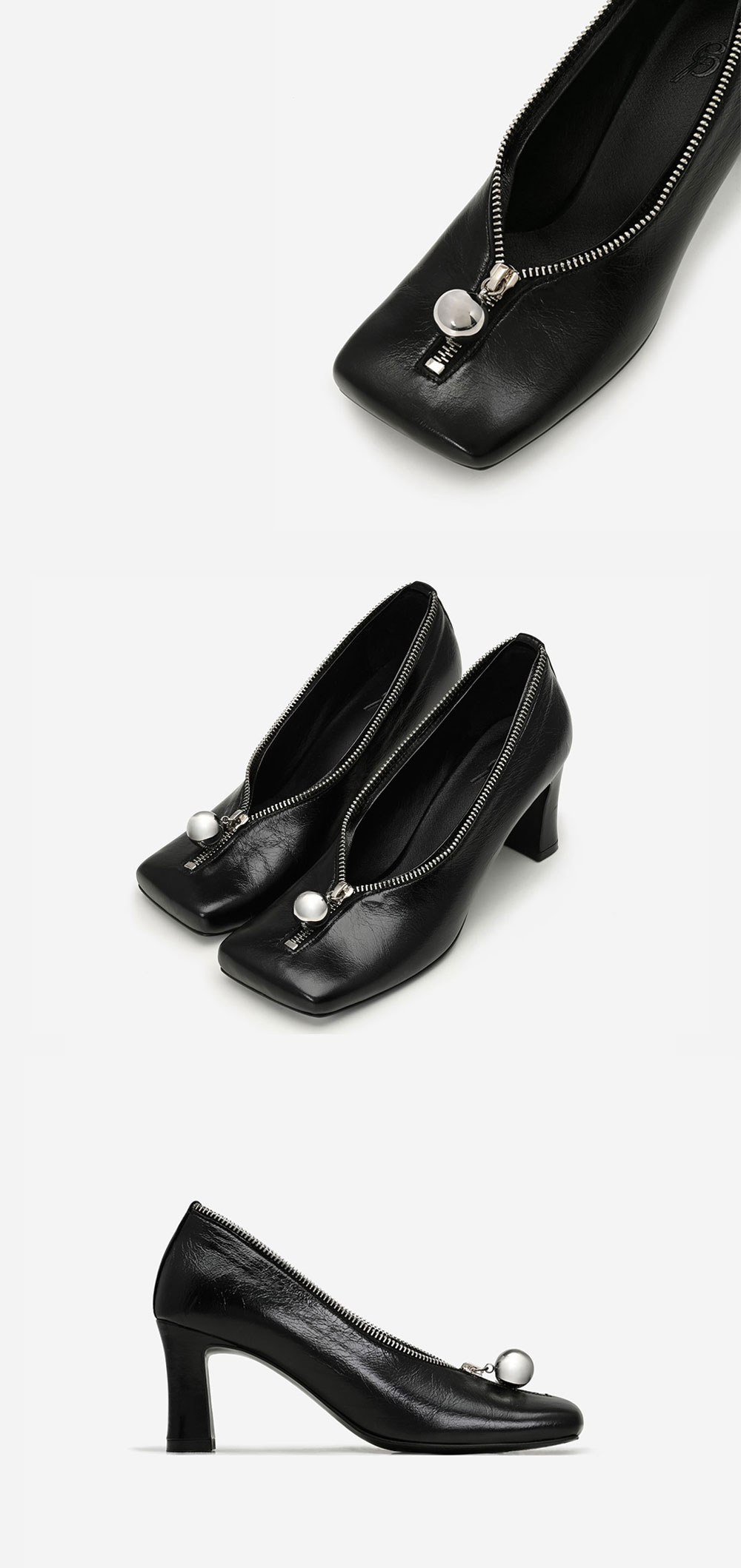 * 1:1 주문 제작으로 진행 되어 배송까지 약 7-14일 소요되실 수 있으며, 교환 및 반품은 불가한 점 참고 부탁드립니다. 감각적인 형태의 세미-스퀘어 앞코와 깔끔한 실버 장식의 조화로 유니크하면서도 한층 더 절제된 무드를 완성합니다. 앞코와 부드럽게 연결되는 발등 라인은 착용 시 안정감 있게 발등을 감싸주며, 발을 넣고 빼기에 불편하지 않도록 적당한 길이로 설정되었습니다. 니켈 컬러의 지퍼가 슈즈 입구를 감싸 장식적인 요소로 작용하고, 지퍼 슬라이더에는 실버볼 장식이 더해져 있습니다. 이 지퍼는 기능이 없고 고정된 형태입니다. 굽은 1cm와 7cm로 선택하여 제작할 수 있습니다.
