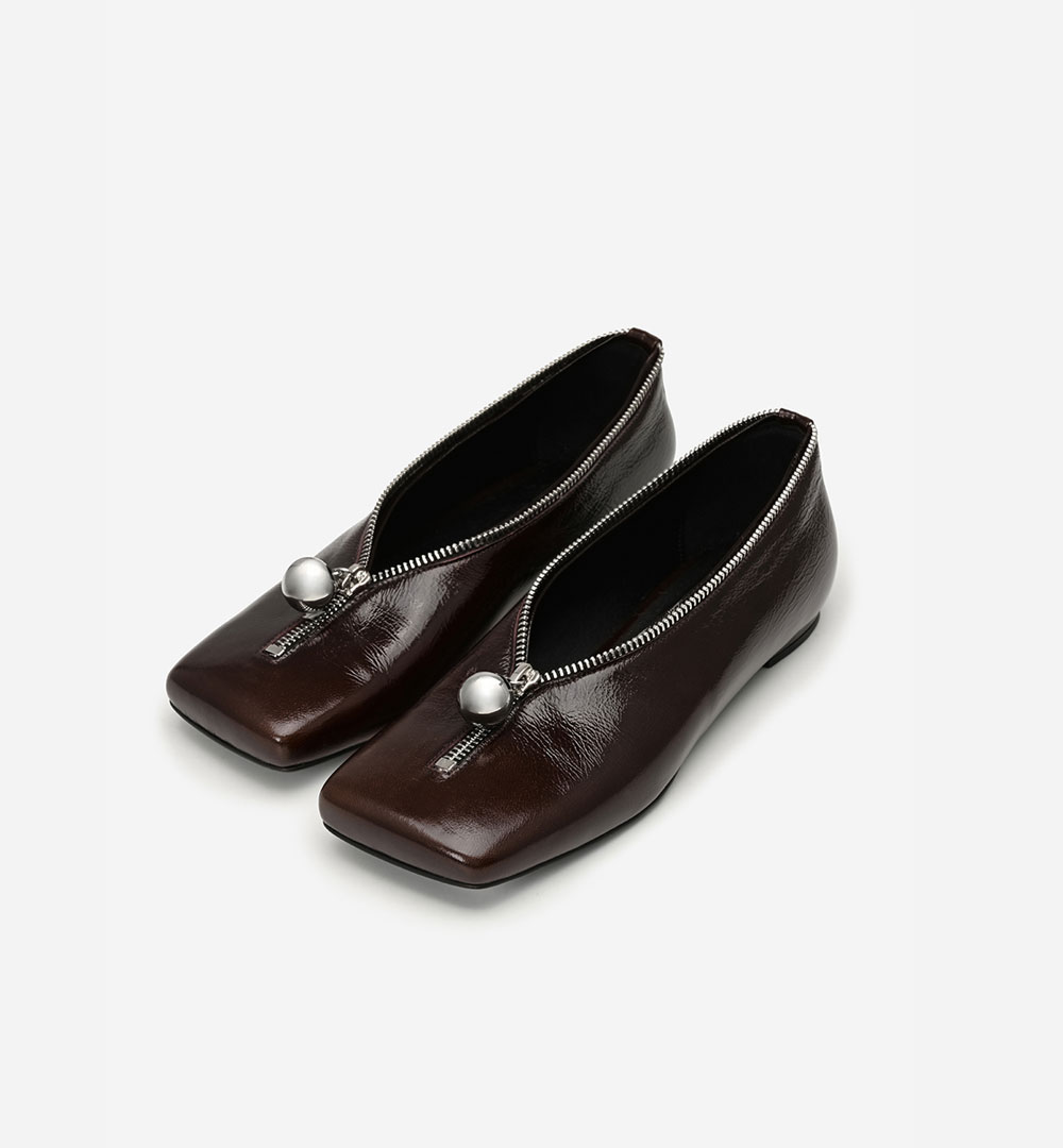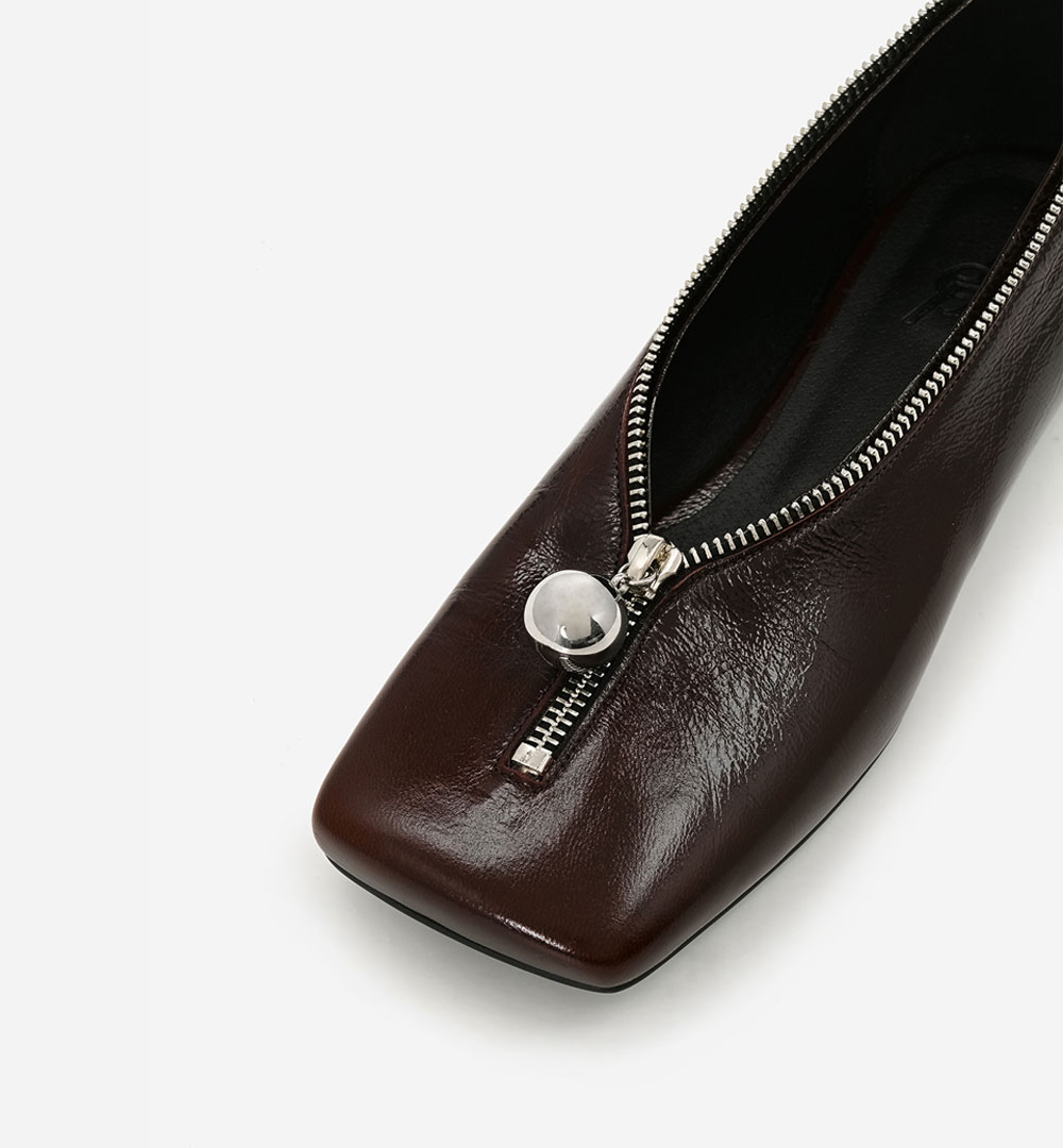 * 1:1 주문 제작으로 진행 되어 배송까지 약 7-14일 소요되실 수 있으며, 교환 및 반품은 불가한 점 참고 부탁드립니다. 감각적인 형태의 세미-스퀘어 앞코와 깔끔한 실버 장식의 조화로 유니크하면서도 한층 더 절제된 무드를 완성합니다. 앞코와 부드럽게 연결되는 발등 라인은 착용 시 안정감 있게 발등을 감싸주며, 발을 넣고 빼기에 불편하지 않도록 적당한 길이로 설정되었습니다. 니켈 컬러의 지퍼가 슈즈 입구를 감싸 장식적인 요소로 작용하고, 지퍼 슬라이더에는 실버볼 장식이 더해져 있습니다. 이 지퍼는 기능이 없고 고정된 형태입니다.