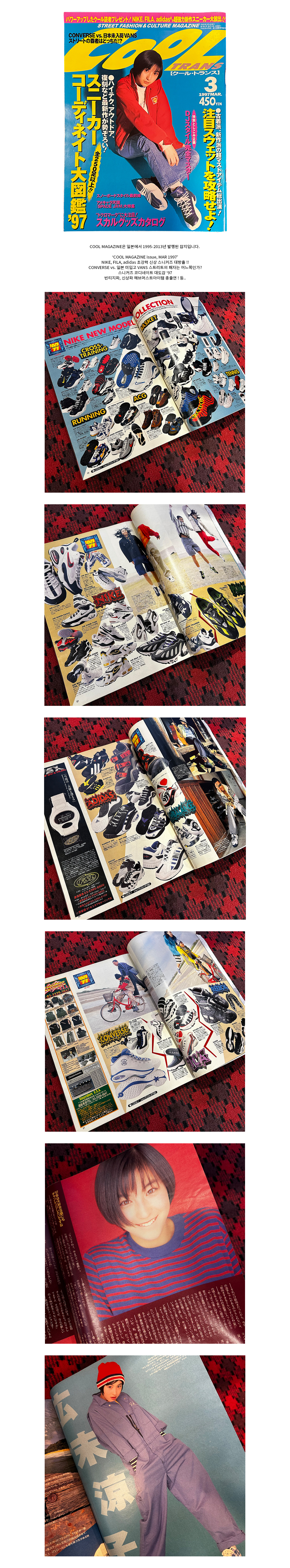 COOL MAGAZINE은 일본에서 1995-2013년 발행된 잡지입니다. ‘COOL MAGAZINE issue, MAR 1997’ NIKE, FILA, adidas 초강력 신상 스니커즈 대방출 !! CONVERSE vs. 일본 미입고 VANS 스트리트의 패자는 어느쪽인가? 스니커즈 코디네이트 대도감 ‘97 빈티지파, 신상파 해브머스트아이템 총출연 ! 등..
