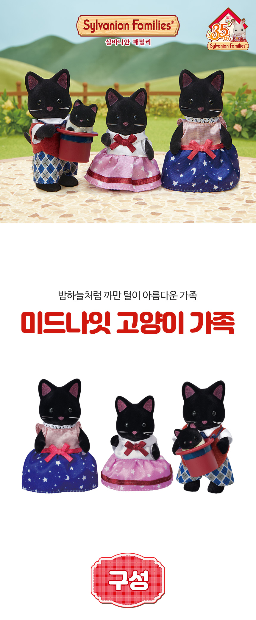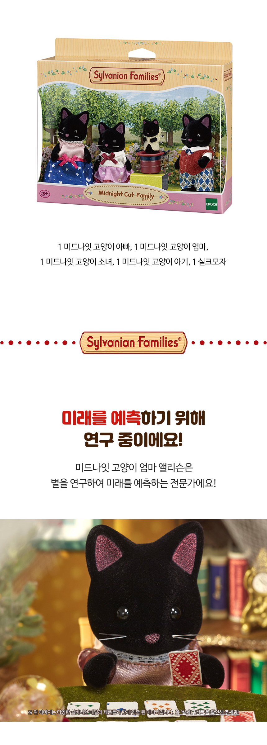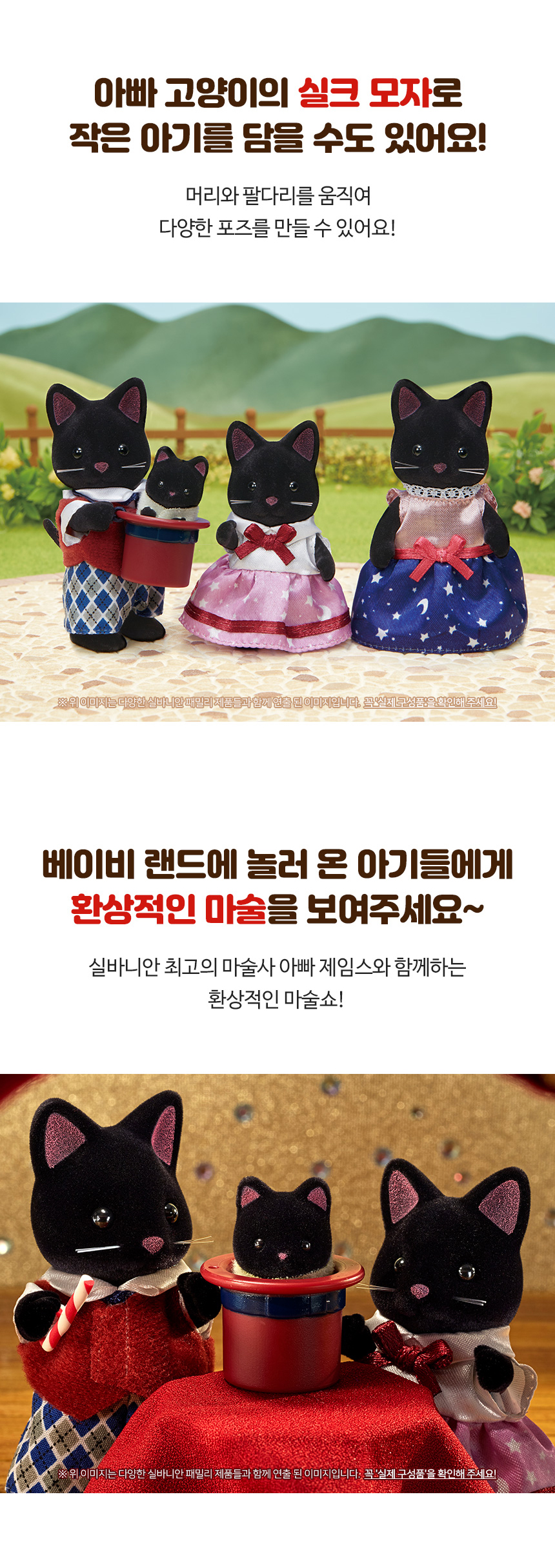 1) 밤하늘처럼 까만 털이 아름다운 미드나잇 고양이 가족입니다. 2) 실바니안 마을의 최고의 마술사 미드나잇 고양이 아빠 제임스, 별을 연구하여 미래를 예측하는 전문가 미드나잇 고양이 엄마 앨리슨, 어려움에 처한 친구들을 잘 도와주는 미드나잇 고양이 소녀 샨텔, 자유분방한 미드나잇 고양이 아기 레지 3) 미드나잇 고양이 아빠의 실크 모자로 작은 아기를 담아서 안을 수 도 있습니다. 4) 베이비 랜드에 놀러온 아기들에게 환상적인 마술을 보여주세요~ 머리와 팔다리를 움직여 다양한 포즈를 만들 수 있어요. 다양한 실바니안 시리즈와 가구 (별매품)와 함께 더욱 풍성한 놀이를 즐겨보세요!"