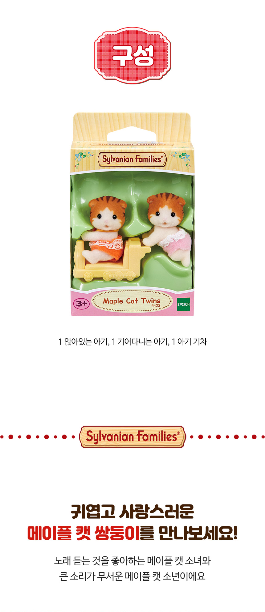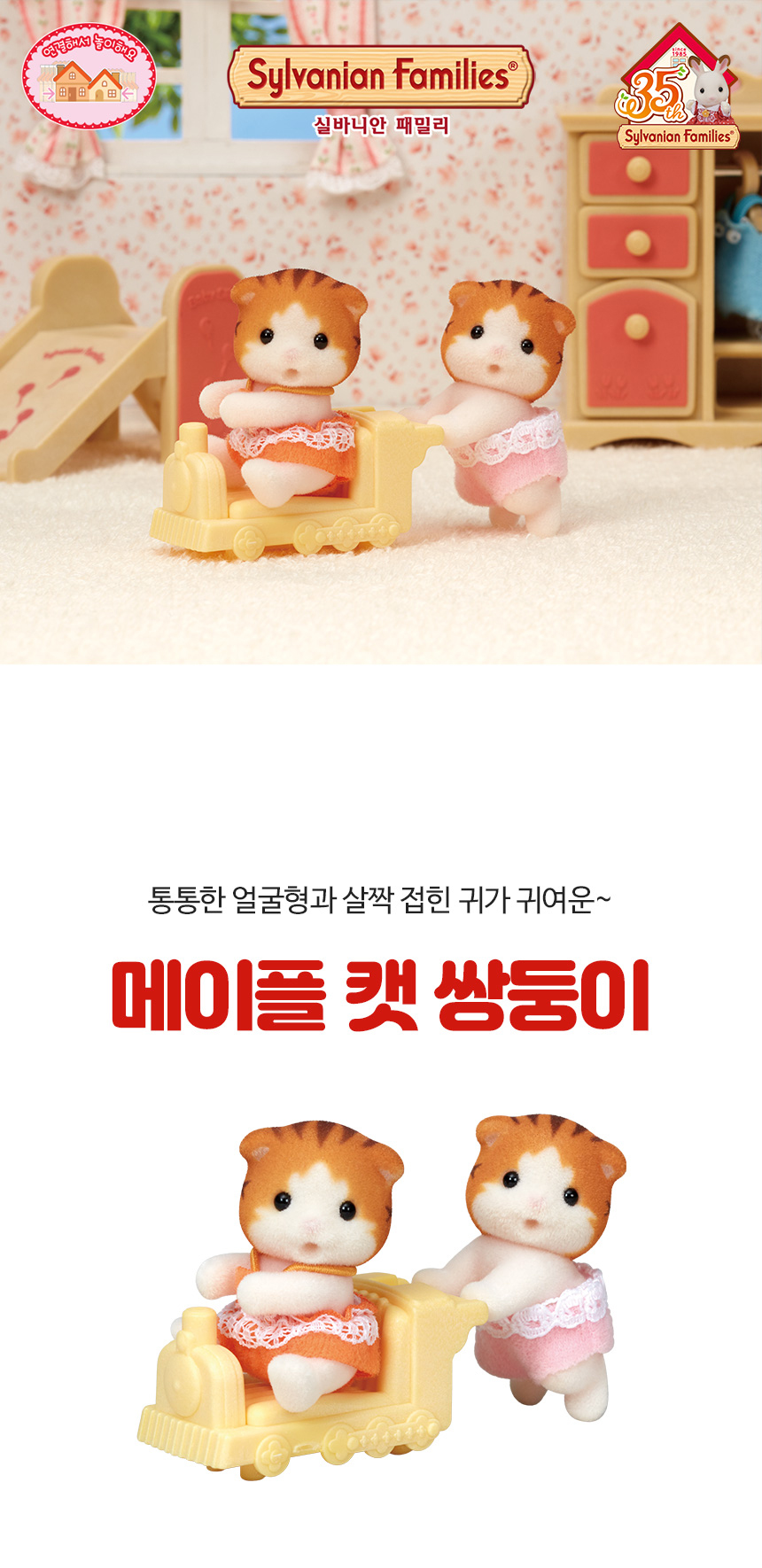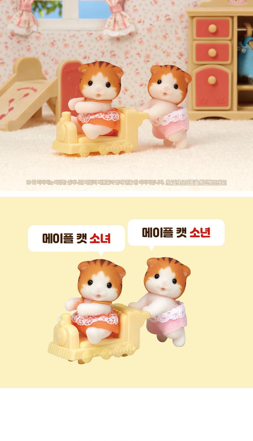 * 통통한 얼굴형과 살짝 접힌 귀가 더욱 귀여워 보이는 메이플 캣 쌍둥이! * 노래 듣는 것을 좋아하는 주황색 아기옷을 입은 메이플 고양이 소녀와, 큰 소리가 나면 무서워하는 분홍색 아기옷을 입은 메이플 고양이 소녀예요. * 재미있게 타고 놀 수 있는 아기 기차가 들어있어요! * 앉아있는 메이플 캣을 기차에 앉혀주고, 기어다니는 메이플 캣이 기차를 밀고 있는 것처럼 꾸며보세요!