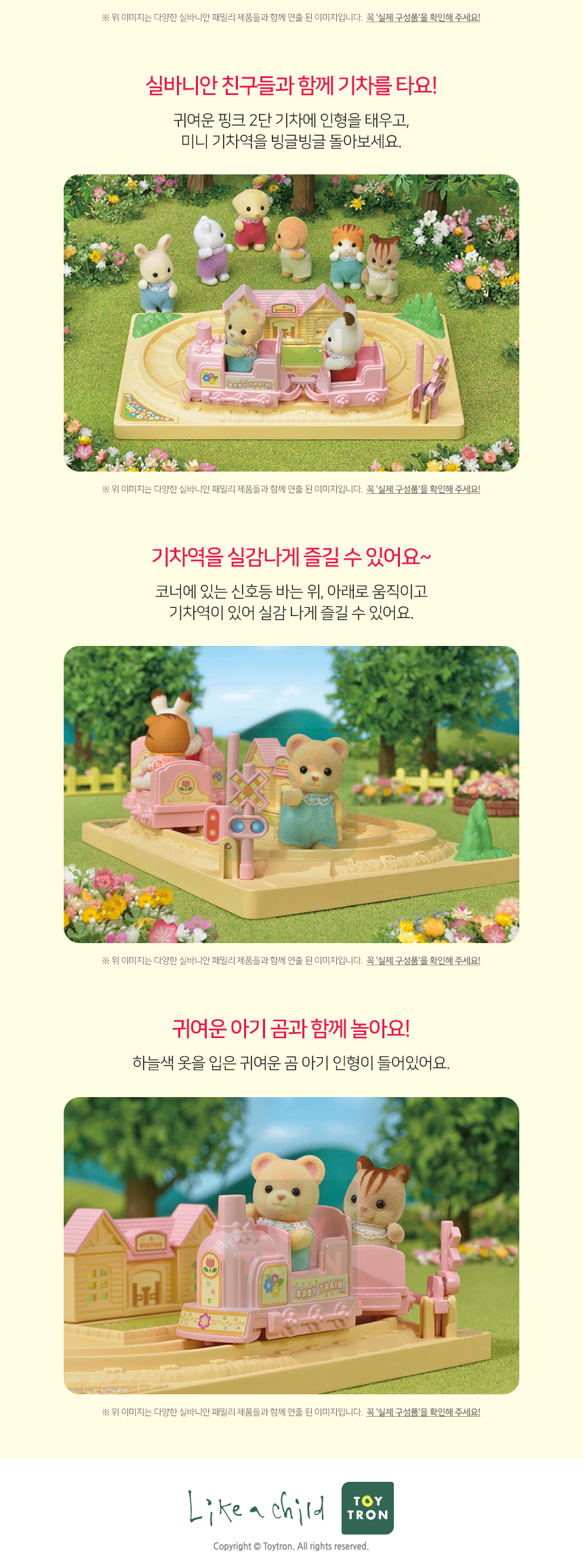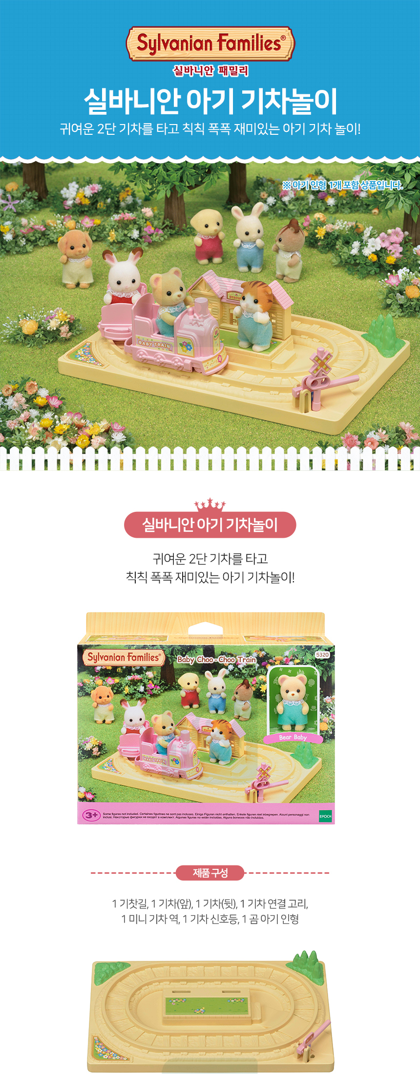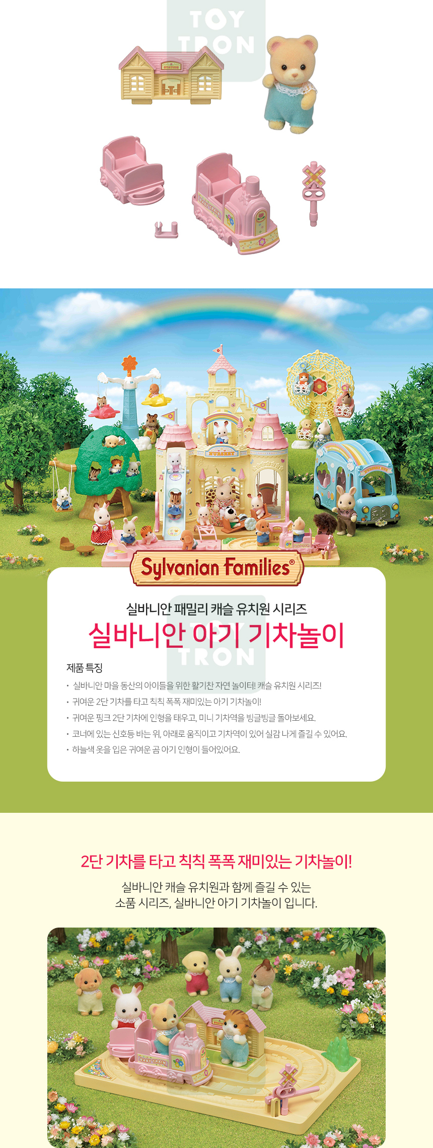 - 실바니안 마을 동산의 아이들을 위한 활기찬 자연 놀이터! 캐슬 유치원 시리즈! - 귀여운 2단 기차를 타고 칙칙 폭폭 재미있는 아기 기차 놀이! - 귀여운 핑크 2단 기차에 인형을 태우고, 미니 기차역을 빙글빙글 돌아보세요. - 코너에 있는 신호등 바는 위,아래로 움직이고, 기차 역이 있어 실감나게 즐길 수 있어요. - 하늘색 옷을 입은 귀여운 곰 아기 인형이 들어있어요.