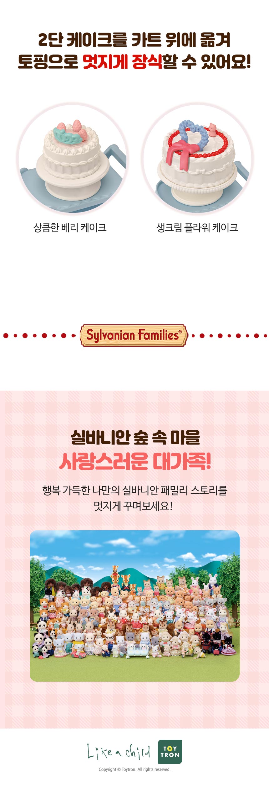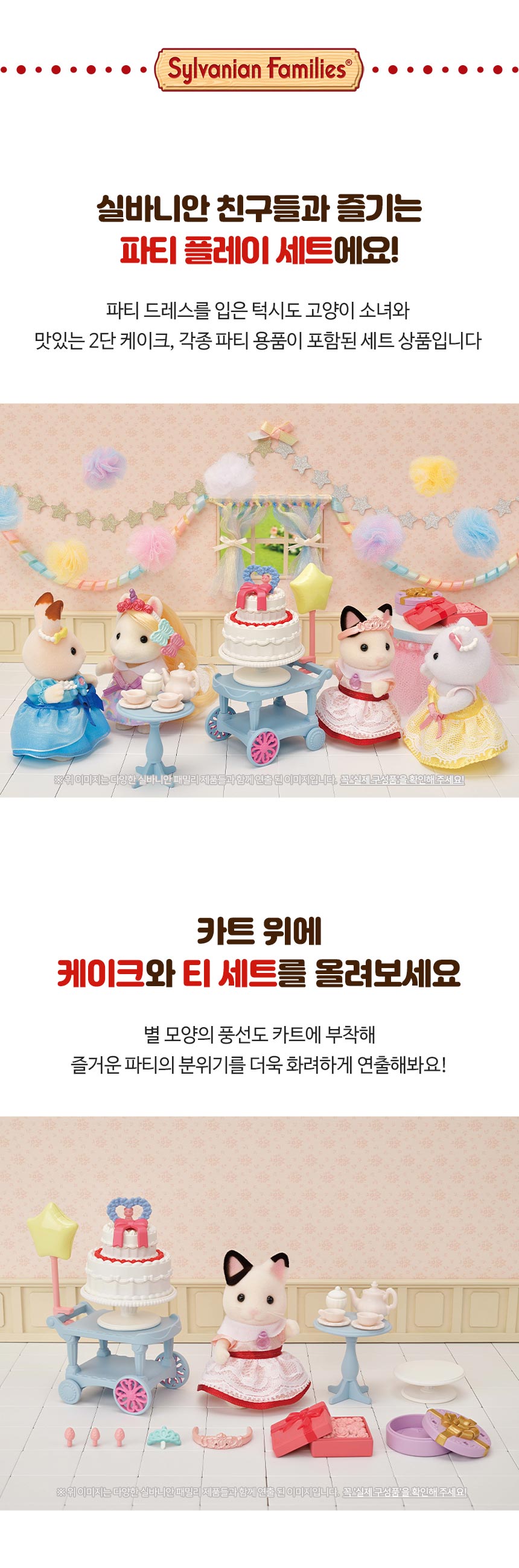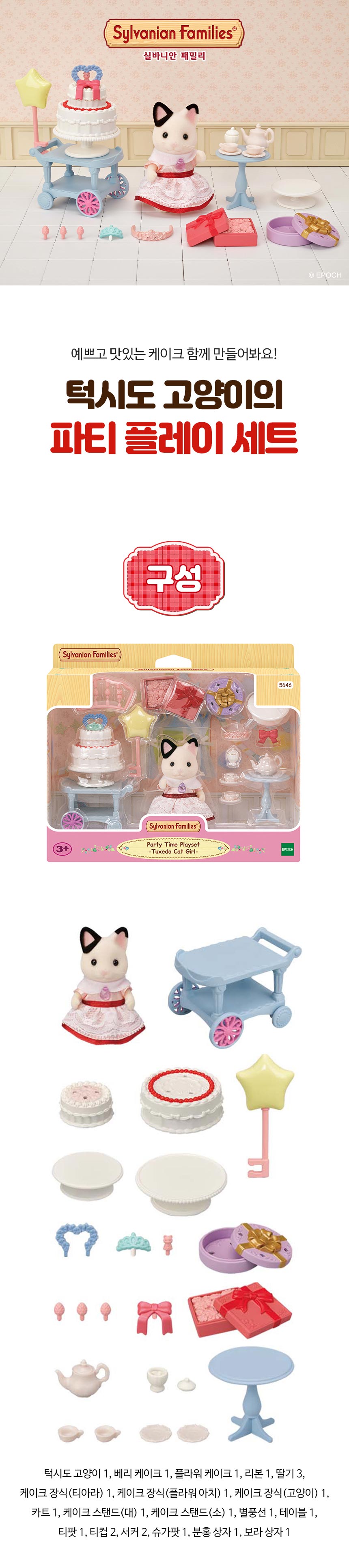 * 턱시도 고양이 소녀 릴리가 파티 드레스를 입고, 호화로운 2단 케이크와 파티 용품이 포함된 세트 상품입니다. * 카트 위에 케이크와 티 세트를 올려보세요! 별 모양의 풍선도 카트에 부착 할 수 있습니다. * 피규어와 액세서리가 포함된 세트이며, 단독으로 플레이 할 수 있습니다. * 단 케이크를 카트 위에 옮겨 토핑으로 멋지게 장식할 수 있어요! * 실바니안 피규어는 머리와 팔다리를 움직여 다양한 포즈를 만들 수 있어요. * 5642_실바니안 포니의 뷰티 헤어 살롱, 5645_프린세스 드레스업 세트, 5644-포니의 헤어 스타일링 세트(별도 판매)와 연결하여 화려한 파티를 연출해 보세요! * 3세 이상 연령에 적합합니다. * 아이들을 위한 상상력 있는 역할극을 자극합니다 * 실바니안 하우스와 결합해 더욱 상상력이 풍부한 역할놀이를 할 수 있어요!