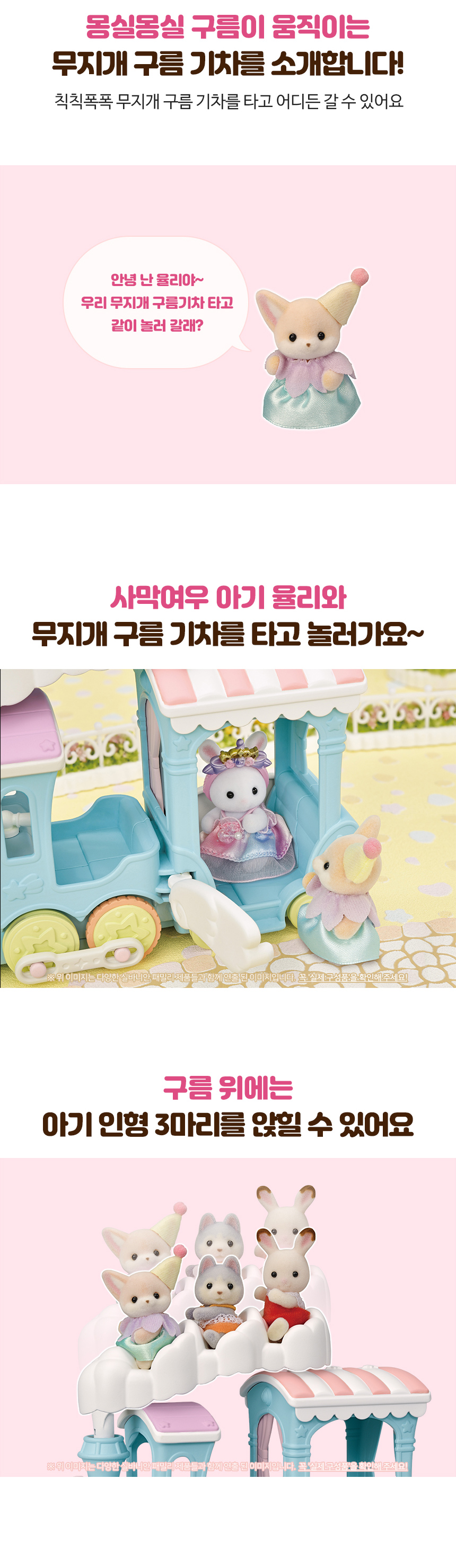 *사막여우 아기 율리를 소개합니다 *기차를 움직이면 굴뚝에 있는 구름이 위아래로 움직여요 *구름 위에는 아기 인형 3마리를 앉힐 수 있습니다 *실바니안 소녀/소년/아기 사이즈의 피규어를 운전석과 승객석에 앉힐 수 있어요 *귀여운 큰 귀가 특징인 사막여우 피규어와 멋진 기차 소품 세트입니다