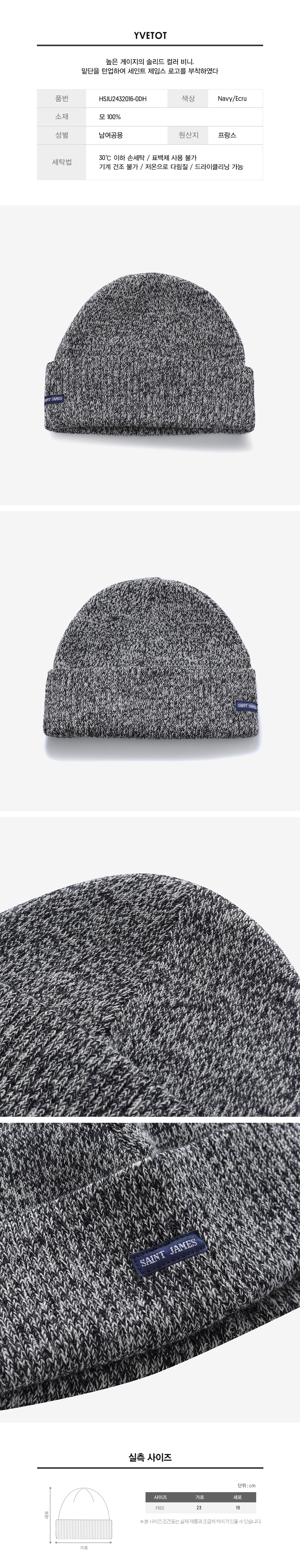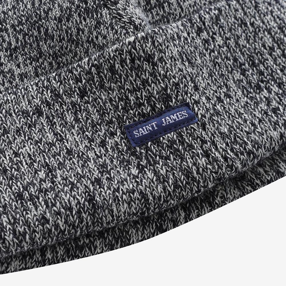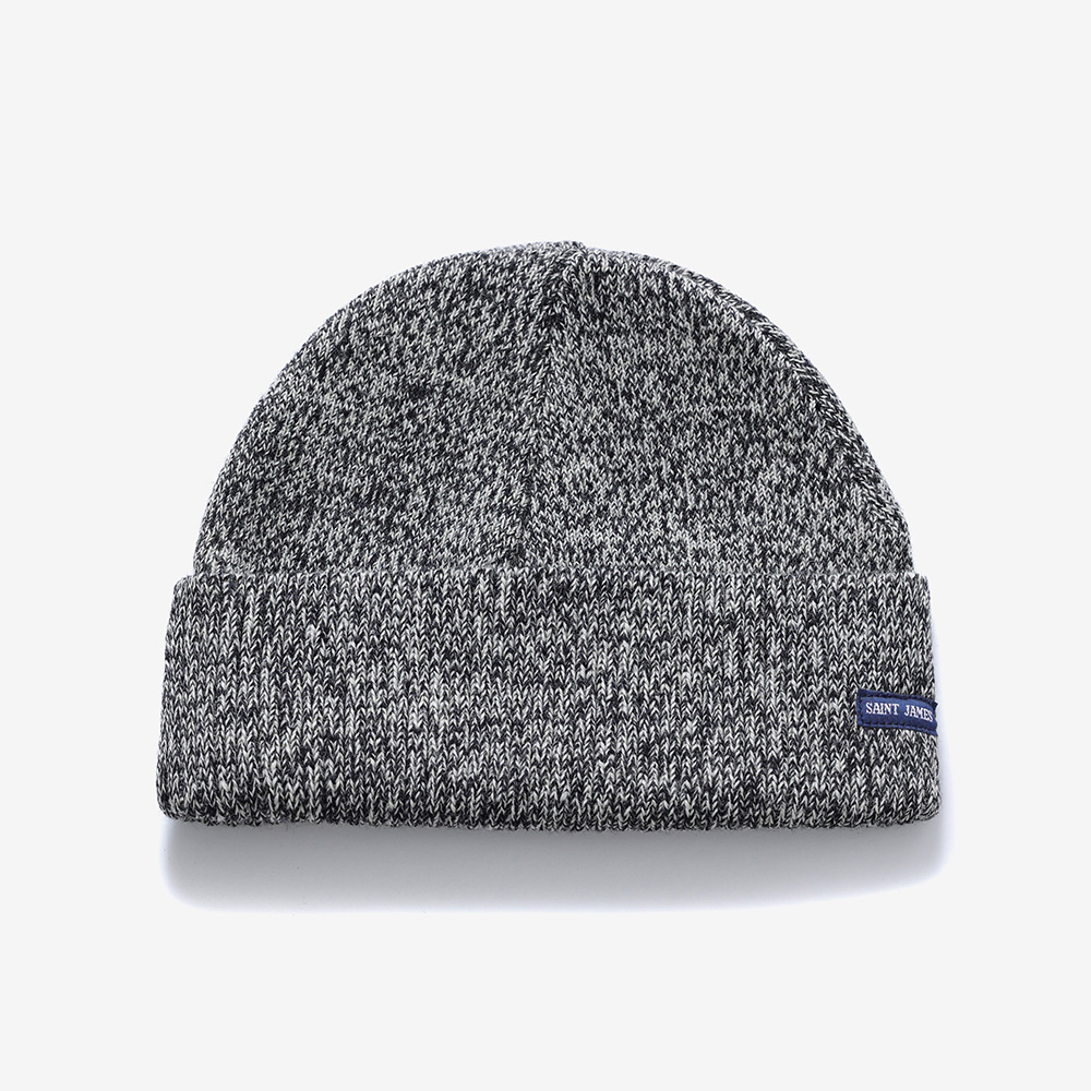 높은 게이지의 솔리드 컬러 비니. 밑단을 턴업하여 세인트 제임스 로고를 부착하였다.