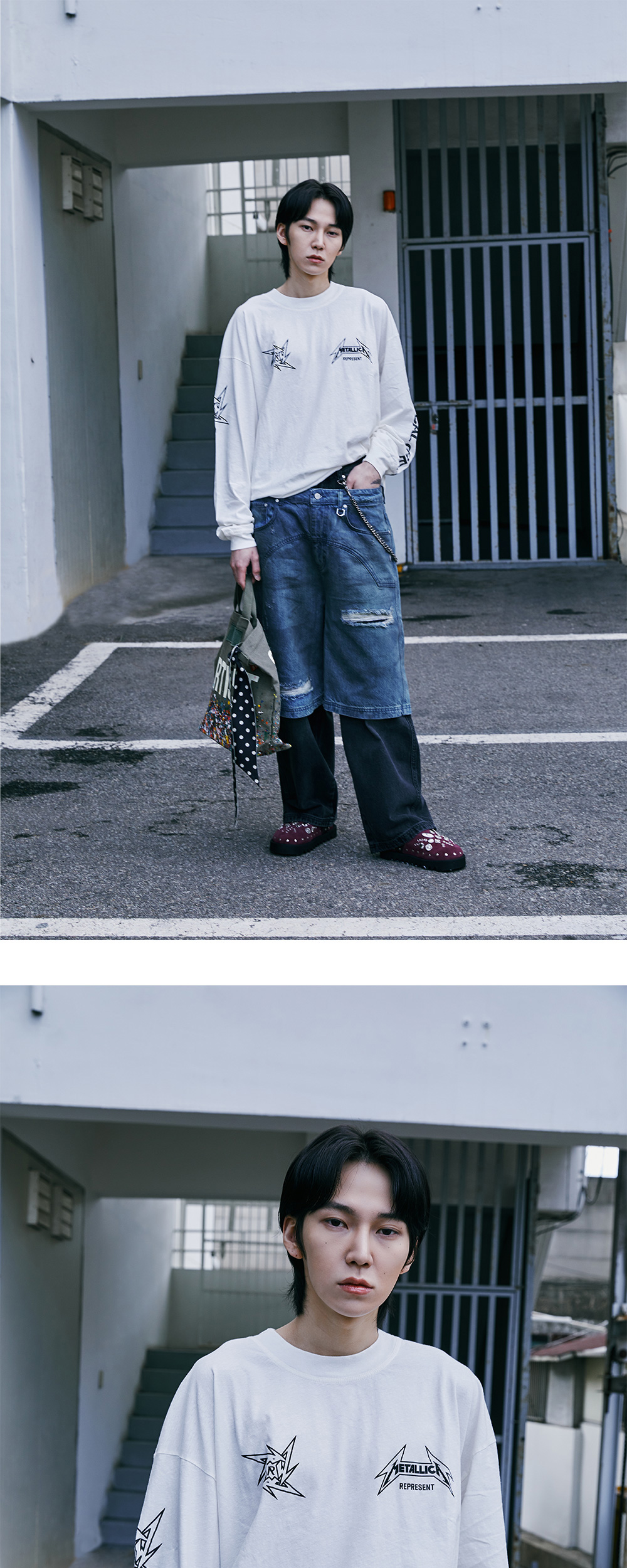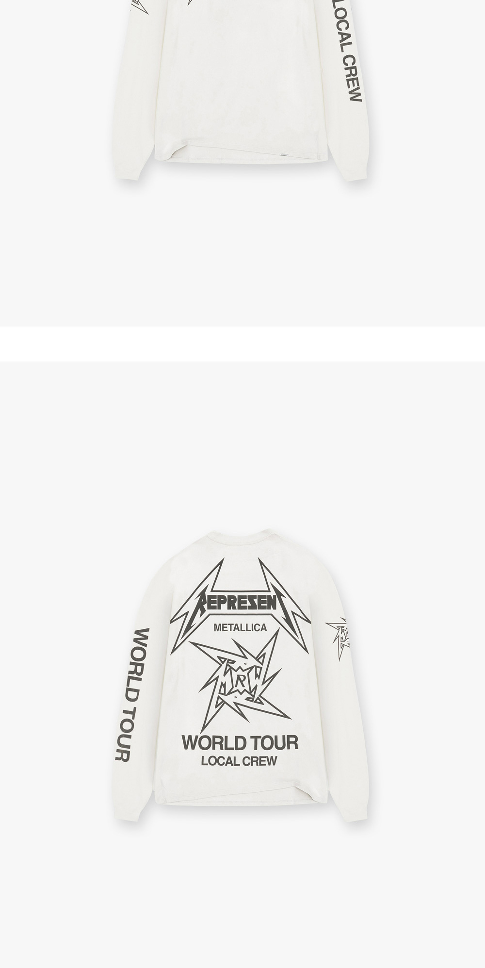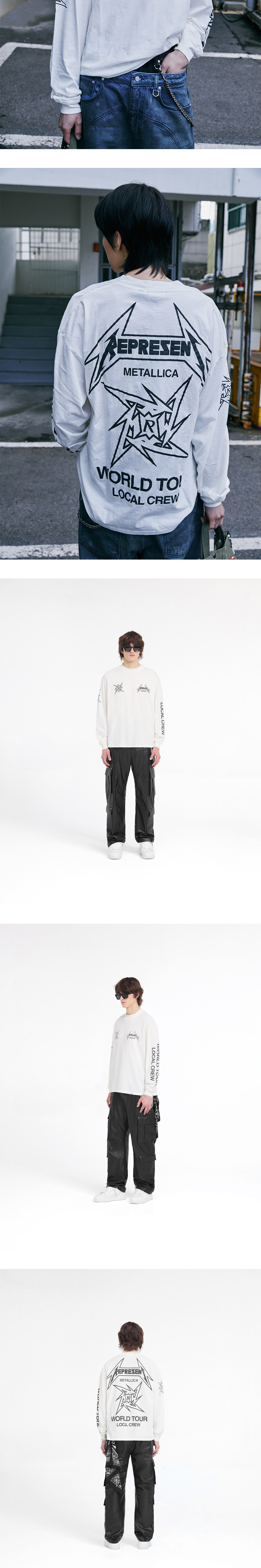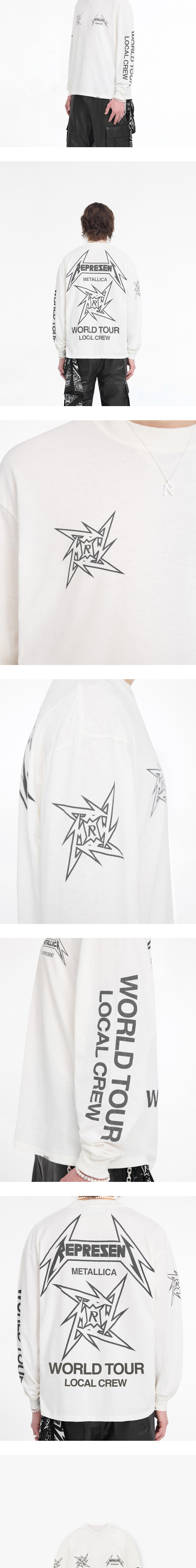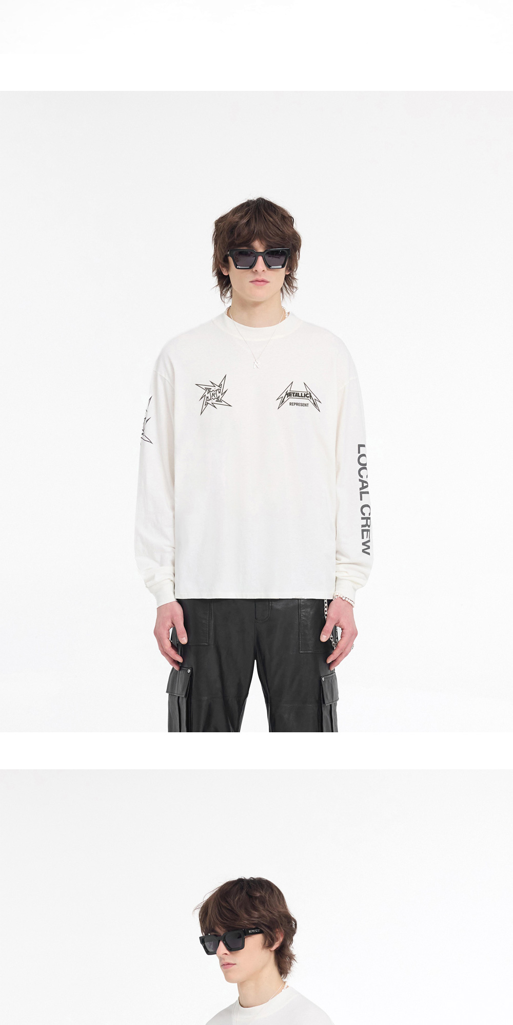 밴드 백스테이지 크루의 정신을 담은 메탈리카 콜라보 제품, 리프레젠트의 40주년 LS 티셔츠 플랫 화이트입니다. - 오버사이즈 핏 - 밑단에 금속 막대 로고 - 닌자 스타 로고의 깨진 프린팅