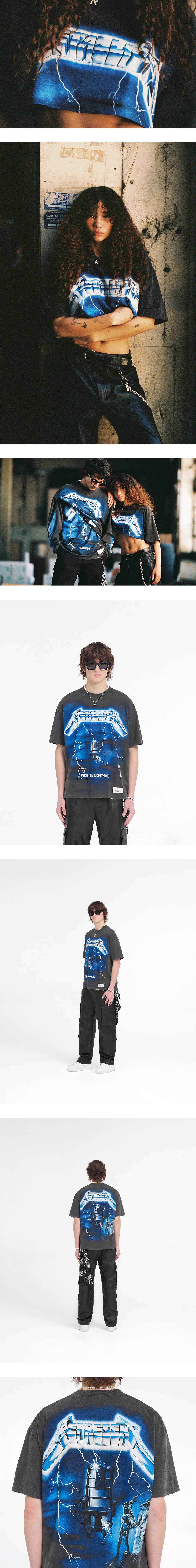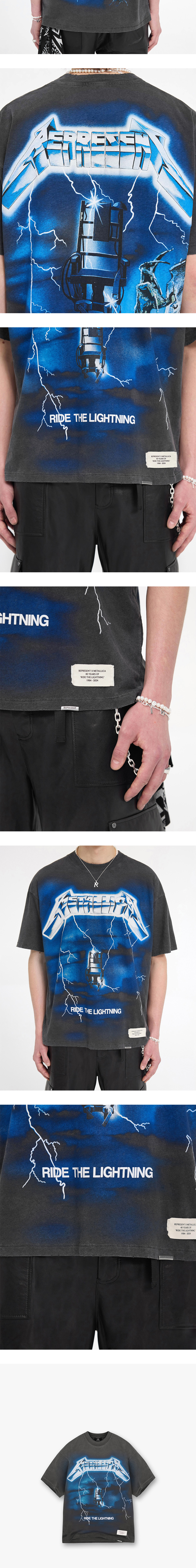 프린팅부터 원단까지 빈티지함이 특징인 메탈리카 콜라보 제품, 리프레젠트의 더 라이트닝 SS 티셔츠 빈티지 그레이입니다. - 약 오버사이즈 핏 - 칼라, 암홀, 밑단에 빈티지 디스트레스트 디테일 - 밑단에 금속 막대 로고, 앞면에는 40주년 기념 패치