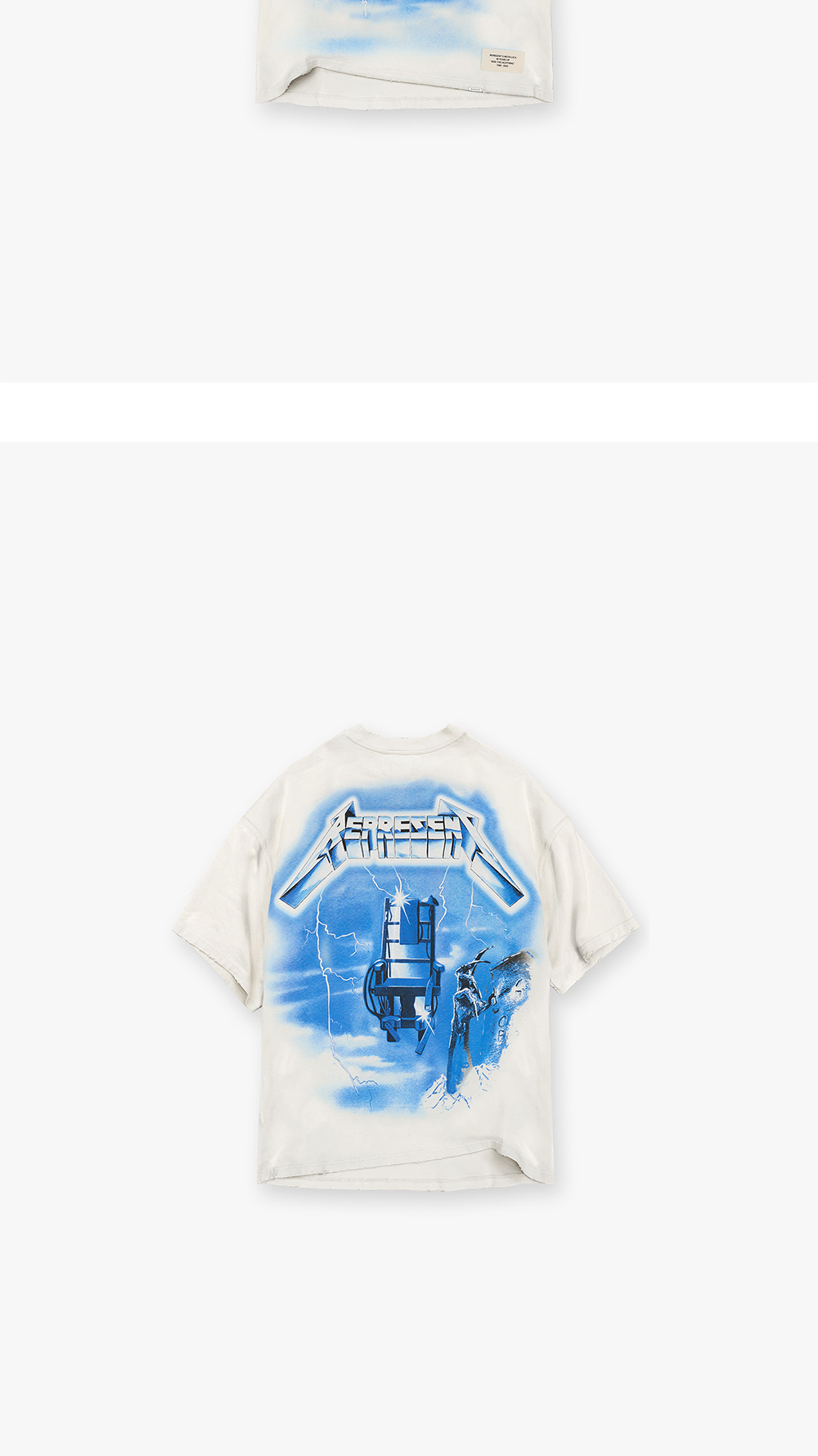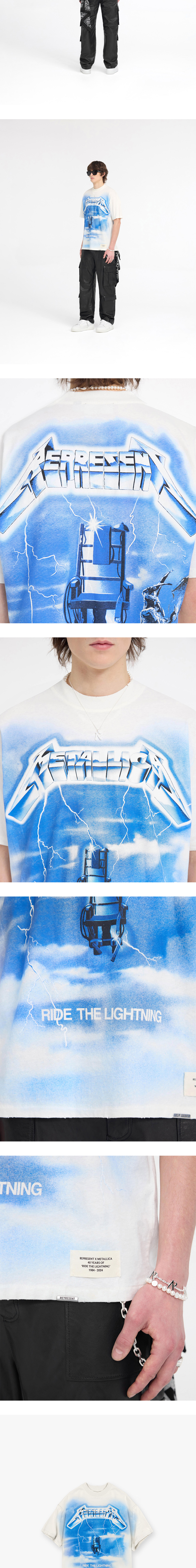 프린팅부터 원단까지 빈티지함이 특징인 메탈리카 콜라보 제품, 리프레젠트의 더 라이트닝 SS 티셔츠 플랫 화이트입니다. - 약 오버사이즈 핏 - 칼라, 암홀, 밑단에 빈티지 디스트레스트 디테일 - 밑단에 금속 막대 로고, 앞면에는 40주년 기념 패치