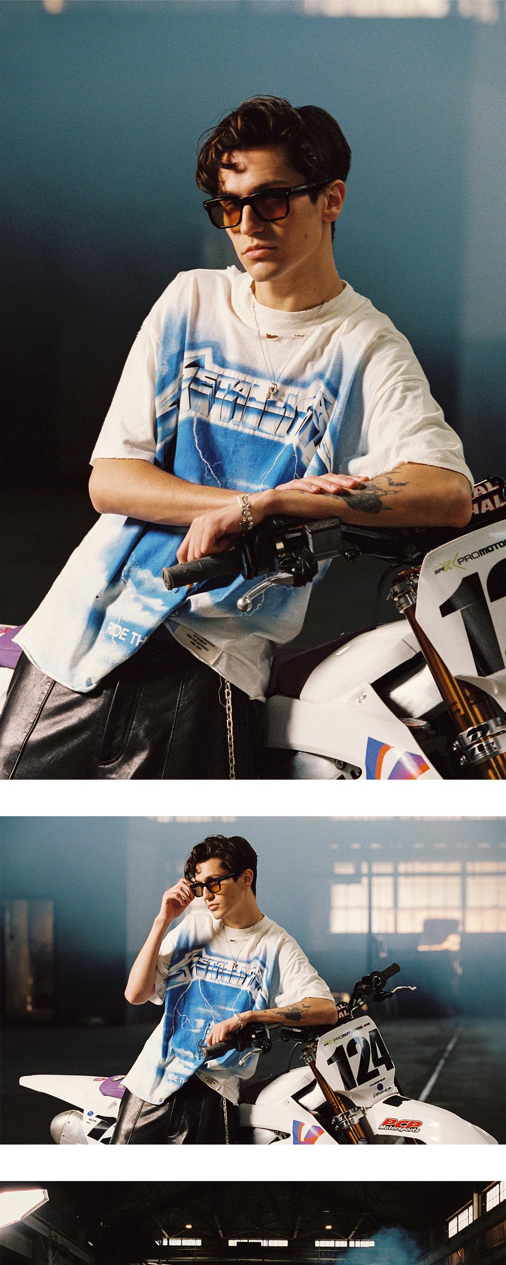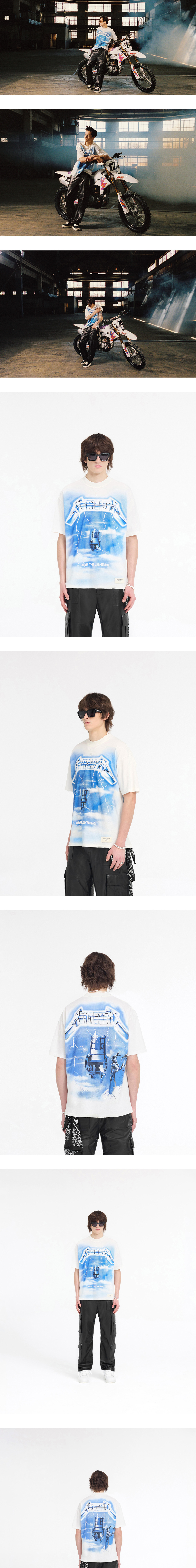 프린팅부터 원단까지 빈티지함이 특징인 메탈리카 콜라보 제품, 리프레젠트의 더 라이트닝 SS 티셔츠 플랫 화이트입니다. - 약 오버사이즈 핏 - 칼라, 암홀, 밑단에 빈티지 디스트레스트 디테일 - 밑단에 금속 막대 로고, 앞면에는 40주년 기념 패치