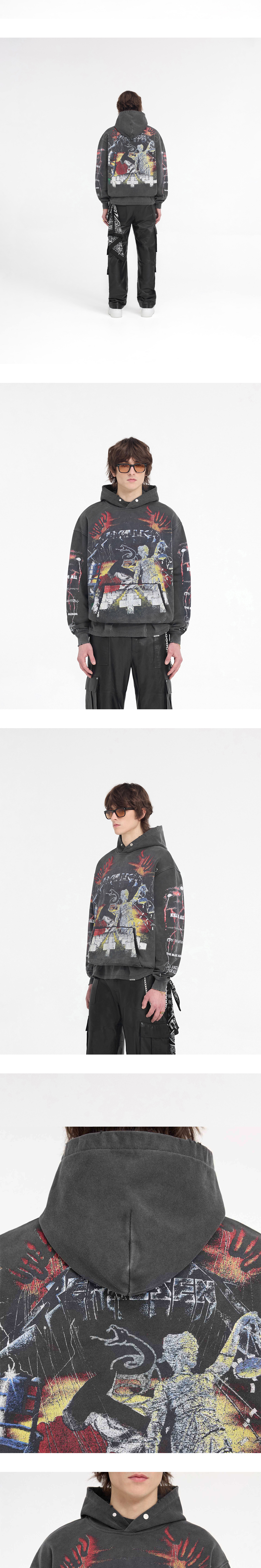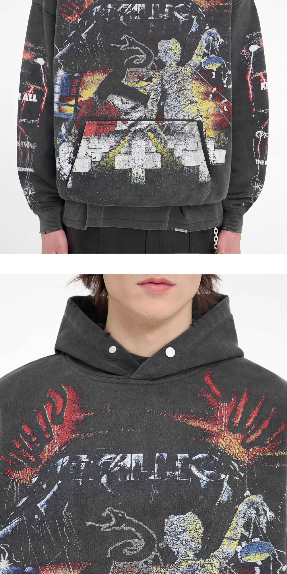 메탈리카의 5개 앨범으로 그래픽을 완성한 리프레젠트의 마스터 오브 퍼펫츠 후디 빈티지 그레이입니다. - 약 오버사이즈 핏 - 후드, 커프스, 밑단에 디스트레스 디테일 - 포켓에 시그니처 리프레젠트 금속 장식