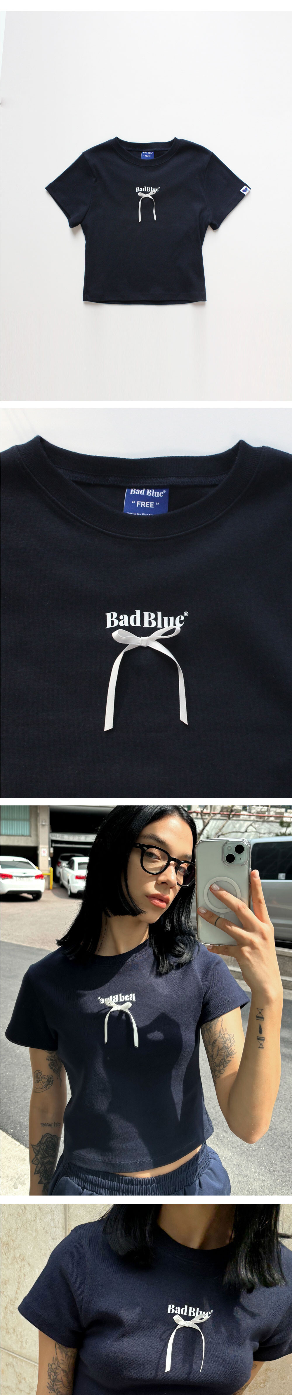 배드블루 리본 로고 슬림 티 네이비