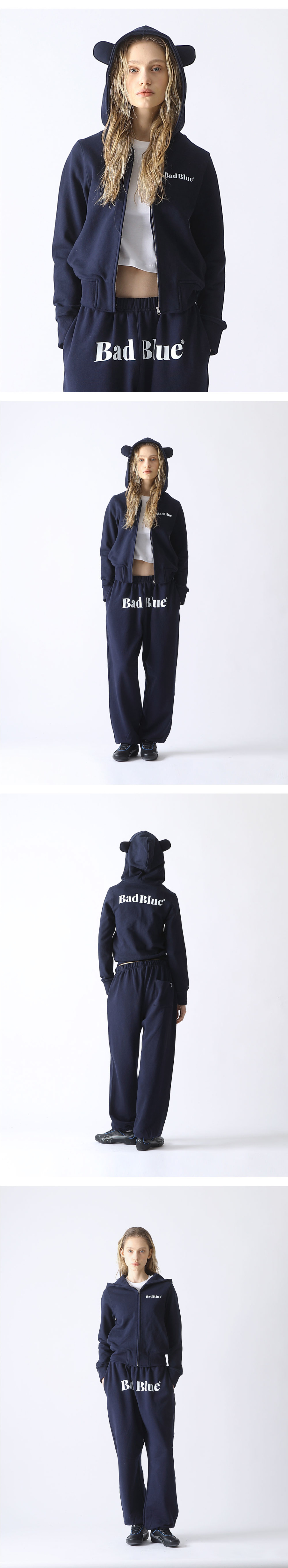 배드블루 베어 이어 집업 크롭 후디 네이비