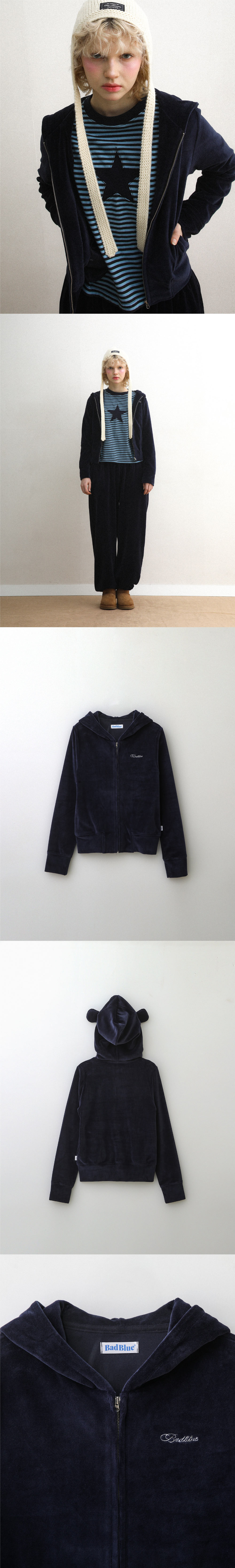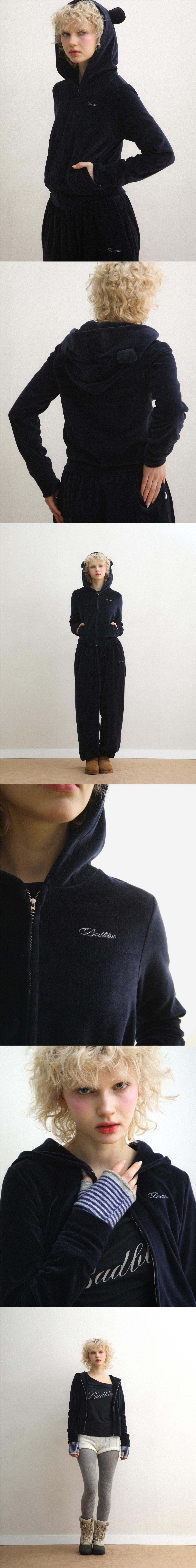 배드블루 벨로아 이어 집업 크롭 후디 네이비