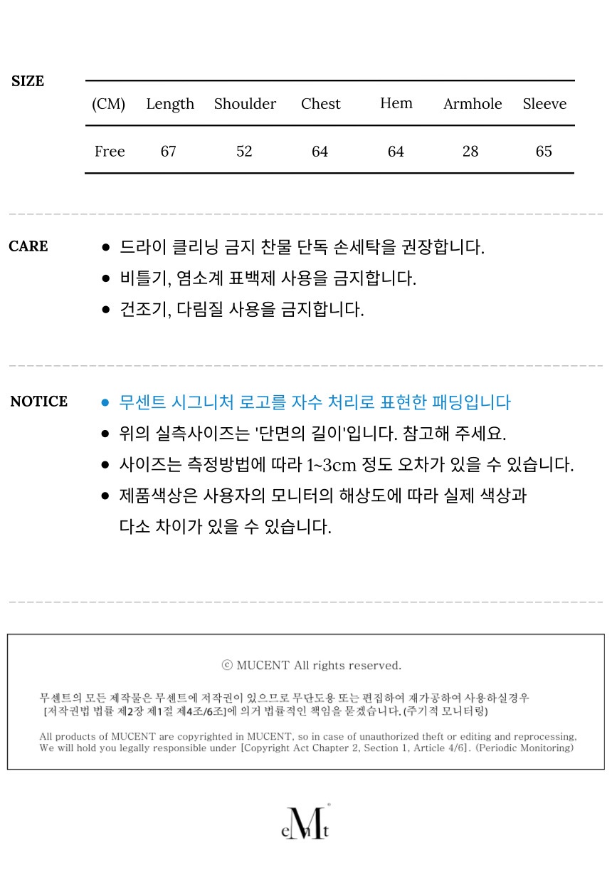 ┃Detail • 무센트 시그니처 로고 포인트 • 2방향으로 개폐 가능한 투웨이 지퍼 • 밑단 스트링으로 두가지 핏 연출 가능 • 폭신폭신한 촉감으로 편안한 착용감 • 벨벳 소재로 부드러운 촉감 • 하이넥 디자인으로 높은 보온성 ┃Material : 겉감: Polyester 100% , 안감: Polyester 100%, 충전재: ┃Care : Dry cleaning - 무센트는 말기의 행성인 이 지구에서 지속 가능한 옷들을 고민합니다. 우리는 신념을 소비하는 미닝아웃을 지지합니다.
