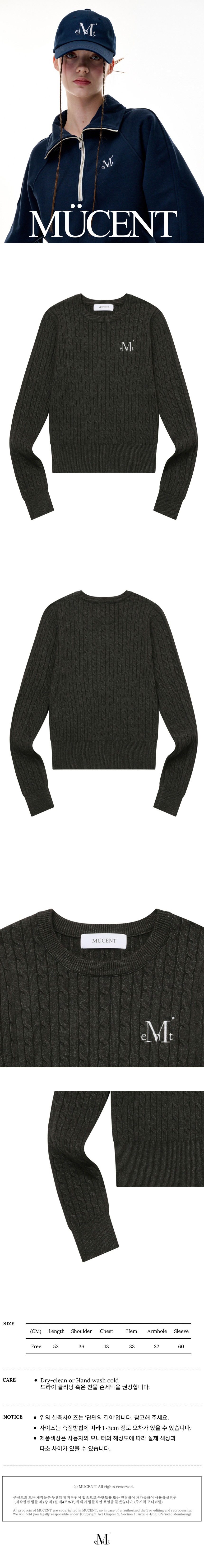 ┃Detail • 전면부 무센트 시그니처 로고 자수 • 라운드 넥 디자인 • 케이블 패턴 디테일 • 우수한 신축성과 편안한 착용감 • 부담스럽지 않은 세미 크롭 기장 • 슬림한 아웃핏 연출 • 다양한 하의와 매치 가능한 데일리 아이템 ┃Material : Polyester 100% ┃Care : Dry cleaning - 무센트는 말기의 행성인 이 지구에서 지속 가능한 옷들을 고민합니다. 우리는 신념을 소비하는 미닝아웃을 지지합니다.