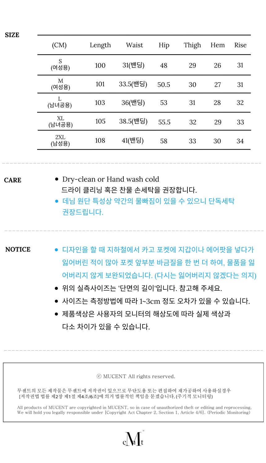 ┃Detail • 백 포켓 무센트 빅 로고 자수 포인트 • 와이드하게 떨어지는 실루엣 • 허리 밴딩으로 편안한 착용감 • 탄탄하면서도 부드러운 데님 원단 • 전후면부 브러쉬워싱 포인트 • 카고 포켓 디테일 ┃Material : Cotton 100% ┃Care : Dry cleaning - 무센트는 말기의 행성인 이 지구에서 지속 가능한 옷들을 고민합니다. 우리는 신념을 소비하는 미닝아웃을 지지합니다.