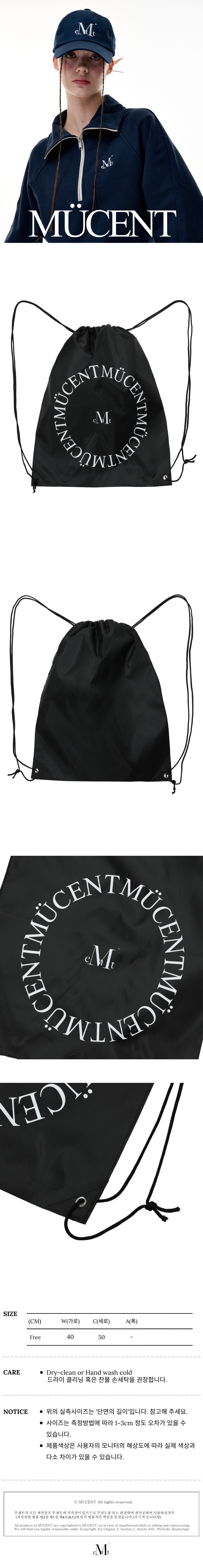 ┃Detail • 데일리하게 맬 수 있는 짐색 • 다용도로 활용 가능 • 가방을 지지해주는 삼각홀 마감 • 방수재질을 사용하여 생활방수 가능 • 무센트 시그니처 원형 로고 프린팅 • 언제든 걸칠 수 있는 코디 포인트 아이템 ┃Material : Polyester 100% ┃Care : Dry cleaning - 무센트는 말기의 행성인 이 지구에서 지속 가능한 옷들을 고민합니다. 우리는 신념을 소비하는 미닝아웃을 지지합니다.