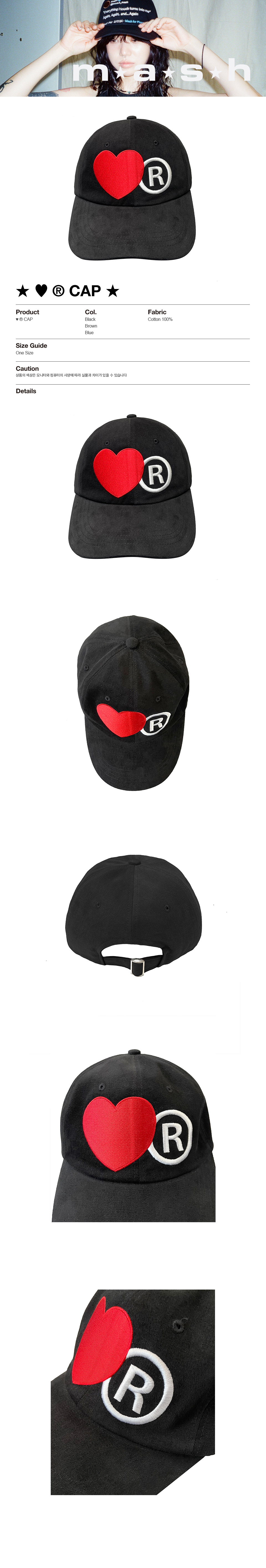 ★ ♥ ® CAP ★ COTTON 100% 세탁기 사용 시 모자의 변형이 있을 수 있으니, 이염된 부분만 손세탁 권장 드립니다 PRODUCT SIZE DEPTH 15CM / BRIM LENGTH 19CM