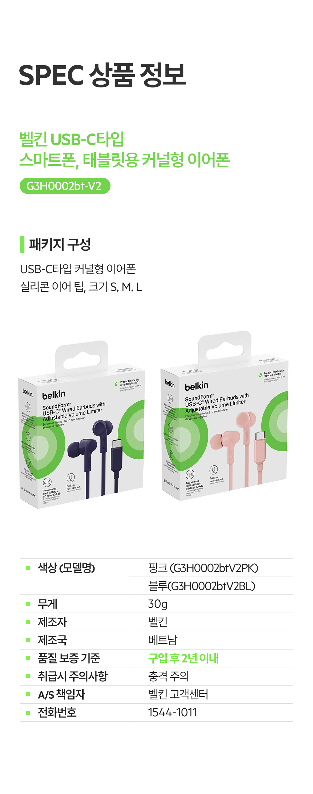 벨킨 C타입 유선 이어폰 G3H0002bt 핑크
