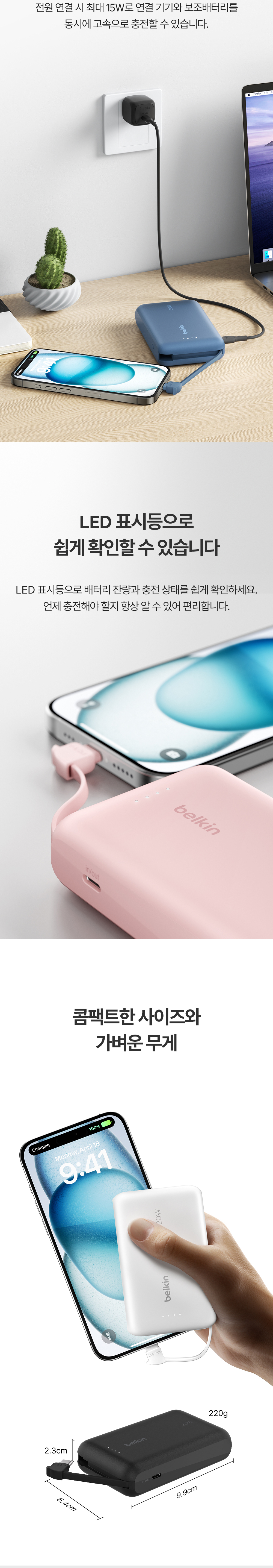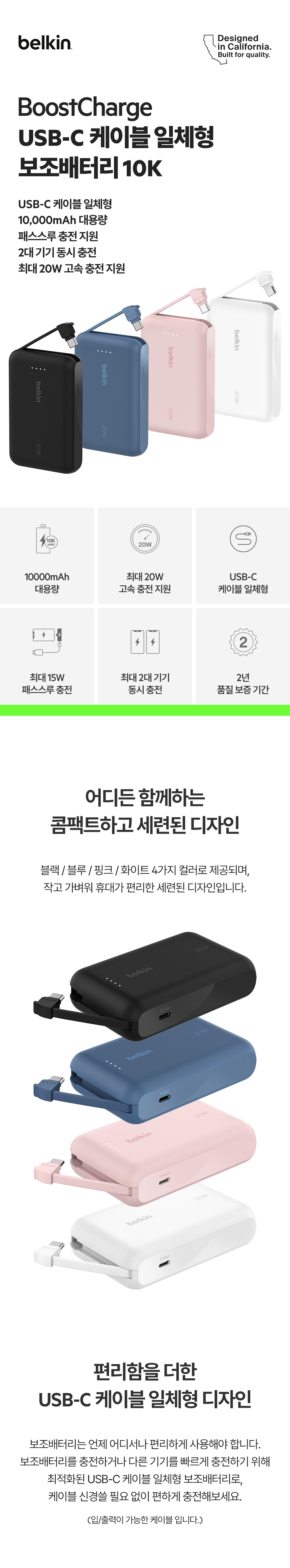벨킨 C타입 케이블 일체형 20W 10000mAh 보조배터리 BPB021fq 블루