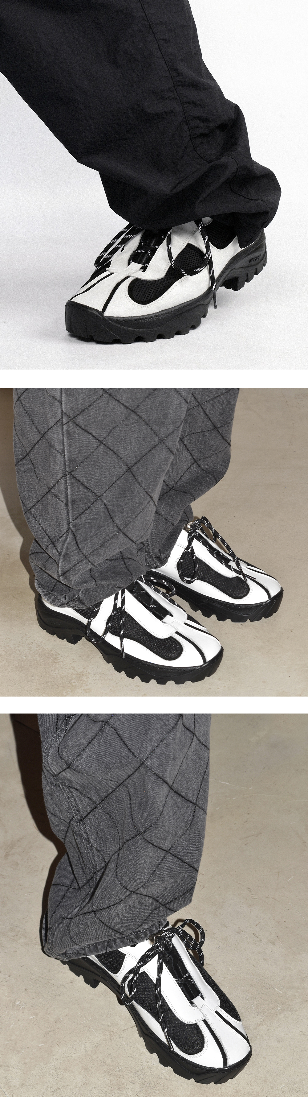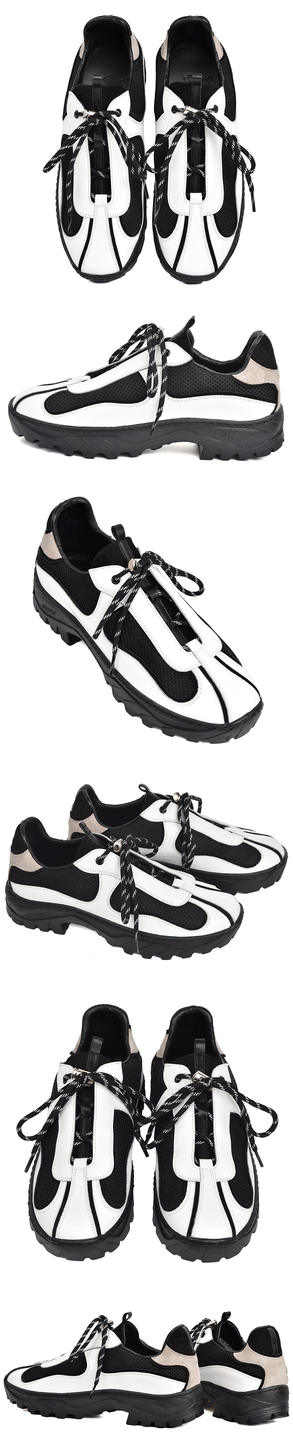 빈티지 프라다,코르테즈,ACG 아카이브에서 디자인을 착안하여 하이킹화, 트래킹화의 보편적인 투박함을 걷어내고 패턴 라인에 구조적인 변형을 가미하여 친숙하지만 유니크한 디테일에 하이엔드적인 무드의 데베시용 트래킹 슈즈 입니다. - 상품정보 Color: Off-White & Black & Taupe Upper: kip skin & Cow Split & mesh Lining: Pig Skin Insole: Latex Foam (0.3cm) & PU Outsole: Vibram rubber sole (4cm) - 제작기간 및 사이즈 정보 * 해당 상품의 경우 제작기간이 12일에서 14일 정도 소요됩니다.(주말, 공휴일 제외한 평일 기준) * 정사이즈로 구매하시는걸 추천해드립니다.(권장 추천 사이즈로 개인 족형에 따라 체감상 느끼시는 사이즈와 다를수 있습니다.) ※ 주문내용의 변경 또는 취소가 어려우니 사이즈 상담이 필요하신 경우 주문 전에 문의 주시기 바랍니다.