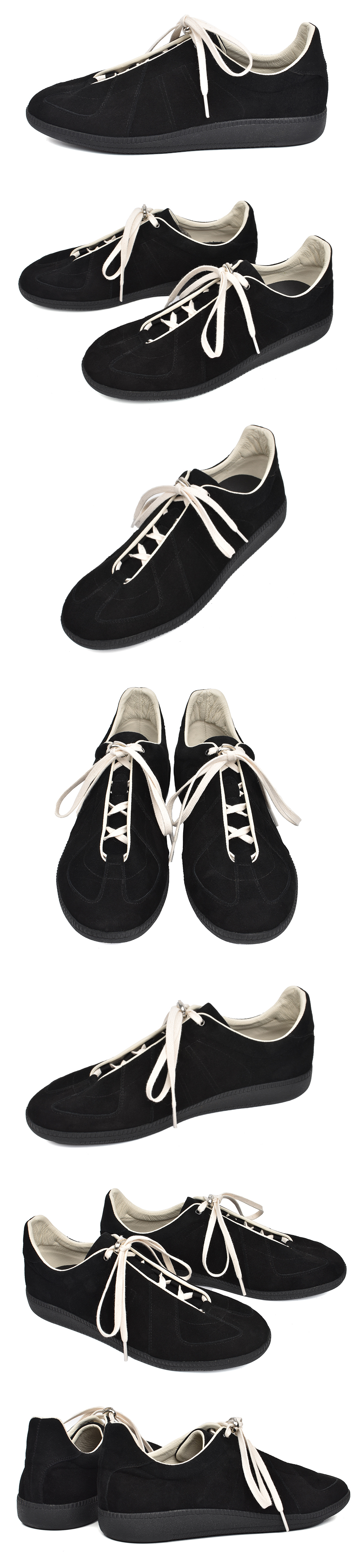 레이싱 슈즈에서 느낄 수 있는 굴곡있는 날렵한 쉐입과 스테디셀러 제품인 독일군 밀리터리 트레이너 슈즈 디테일이 조화롭게 디자인 된 레이싱 트레이너 슈즈입니다. - 상품정보 Color: Deep Black Upper: Cow Split Lining: Cow Skin & Air Mesh Insole: Latex Foam (0.3cm) & PU Outsole: Training Rubber Sole (2.5cm) Non-Slip - 제작기간 및 사이즈 정보 * 해당 상품은 주문 제작상품이므로, 제작 기간은 주말 및 공휴일을 제외한 평일 기준 12~14일 정도 소요됩니다. 이 점 참고하시어 주문 부탁드립니다. * 발볼이 넓지 않고 발등이 높지 않다면 정사이즈로 구매하시는걸 추천해드립니다.(권장 추천 사이즈로 개인 족형에 따라 체감상 느끼시는 사이즈와 다를수 있습니다.) ※ 주문내용의 변경 또는 취소가 어려우니 사이즈 상담이 필요하신 경우 주문 전에 문의 주시기 바랍니다.