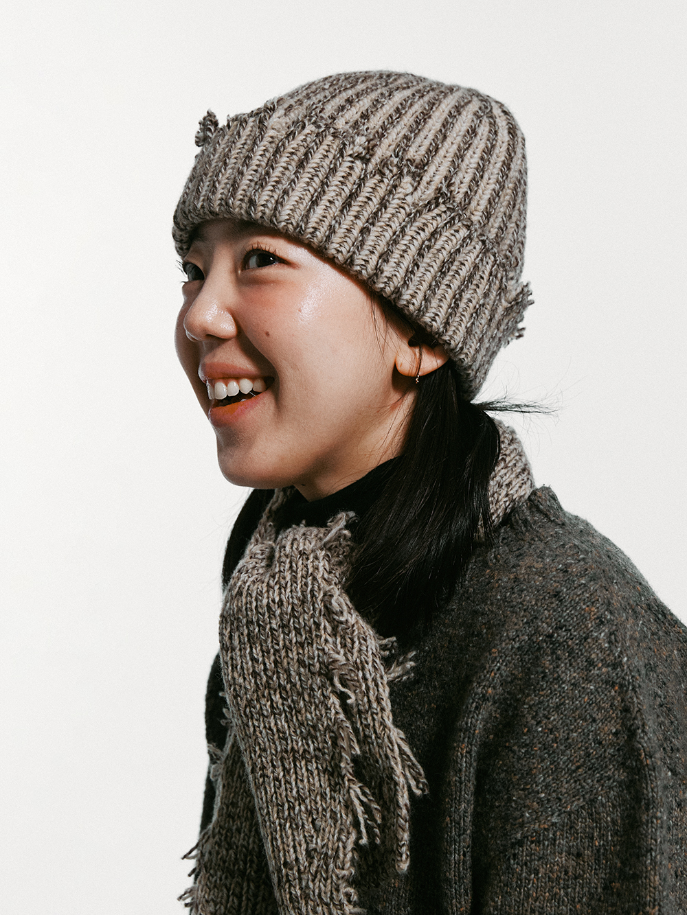 영오 리사이클 얀 프레이드 숏 니트 머플러 브라운