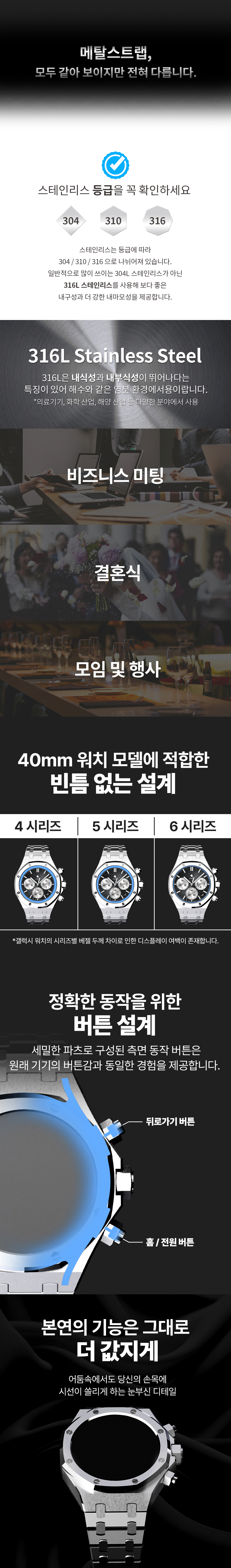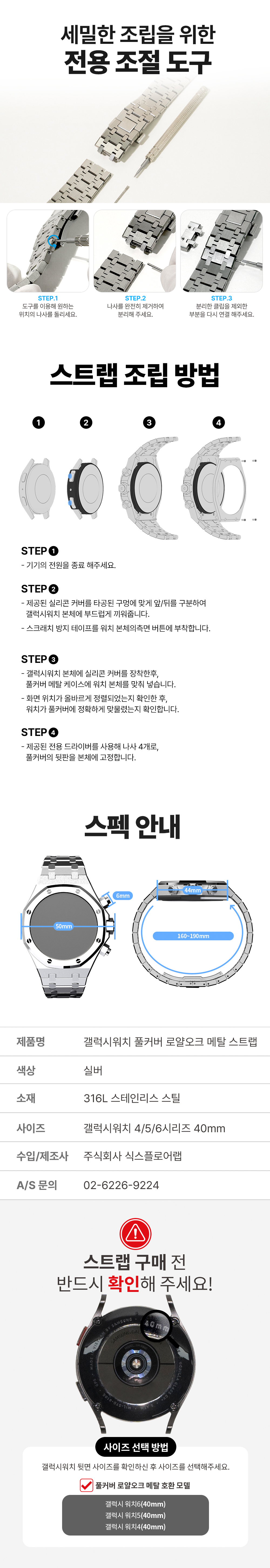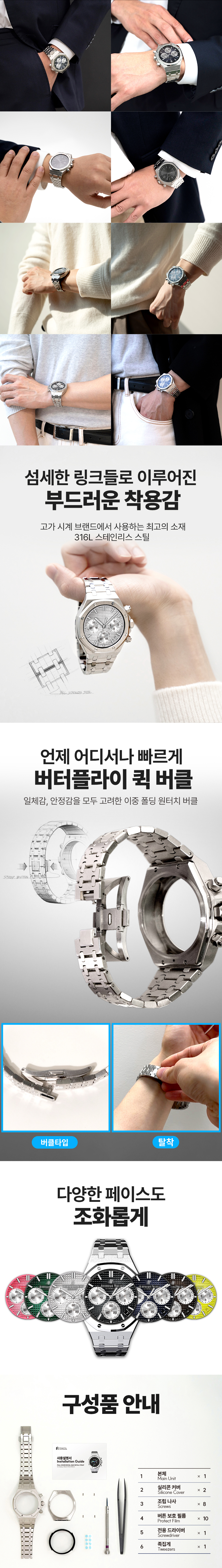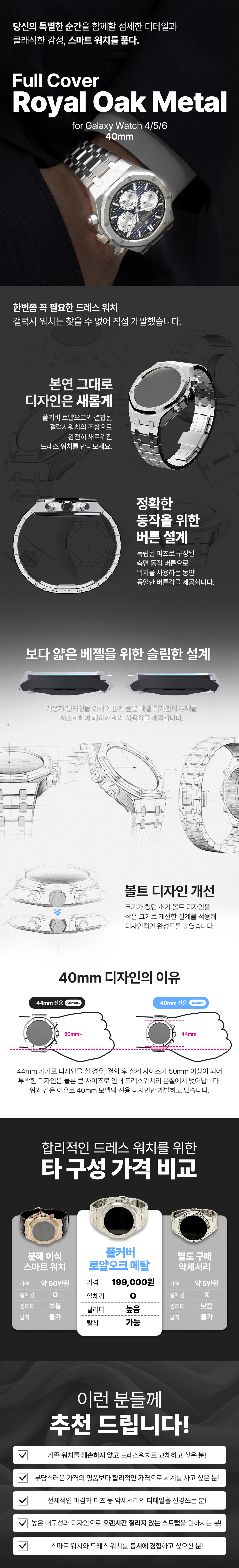 갤럭시워치 6 5 4 40mm 호환 풀커버 로얄오크 일체형 메탈 스트랩 케이스 실버