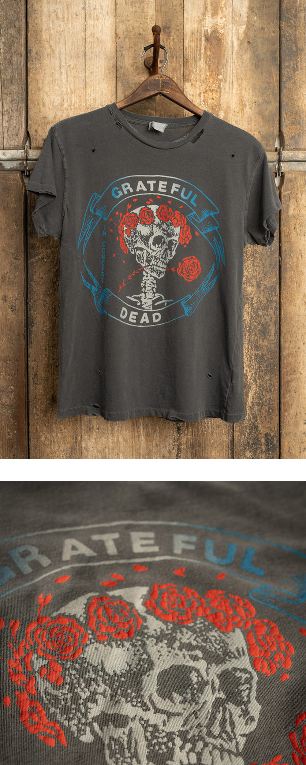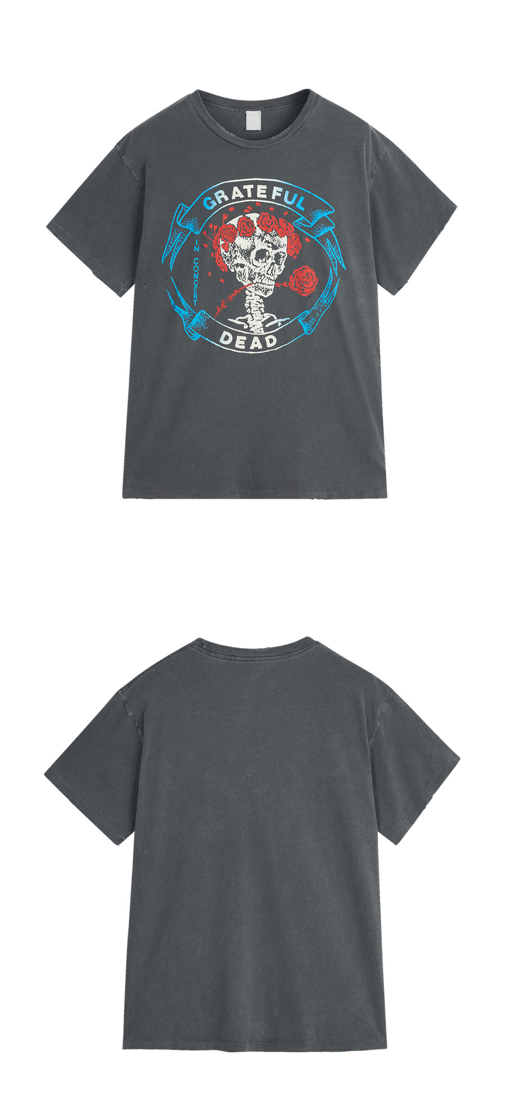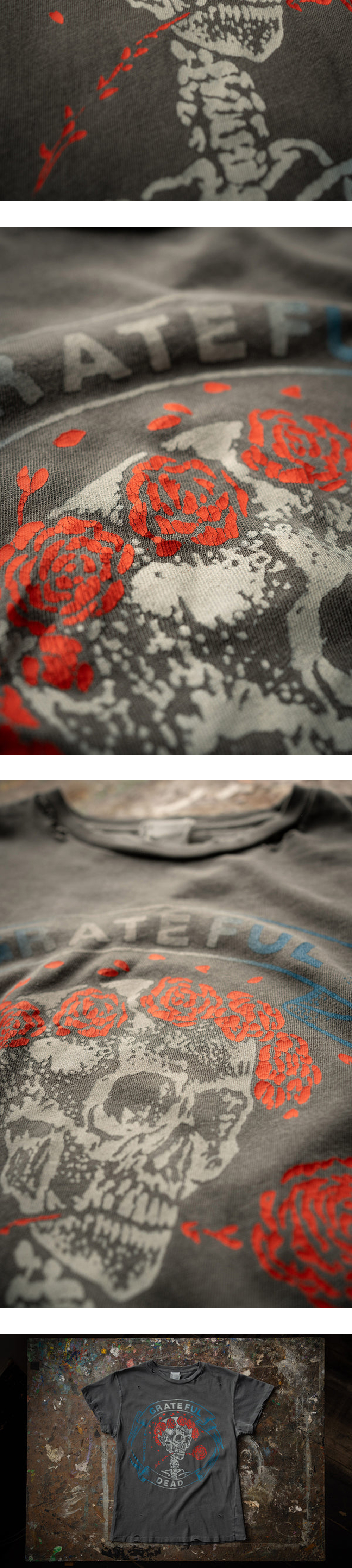 장미에 둘러싸인 해골 그래픽이 빈지티하게 담긴 메이드원의 그레이트풀 데드입니다. - 빈티지 유니섹스 핏 - 짧은 소매 길이, 메이드원 특유의 코튼 소재, 그리고 블라인드 스티치 밑단 - LA에서 수작업 공정으로 제작