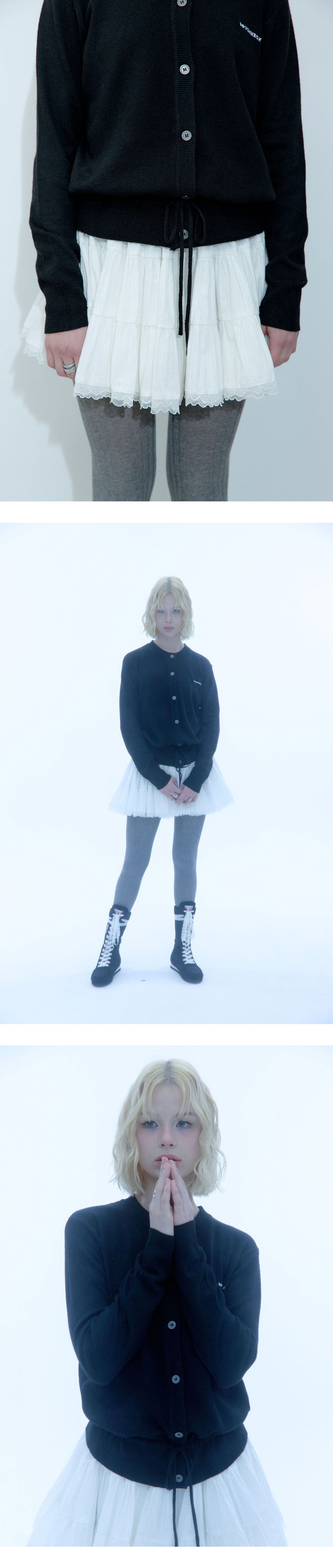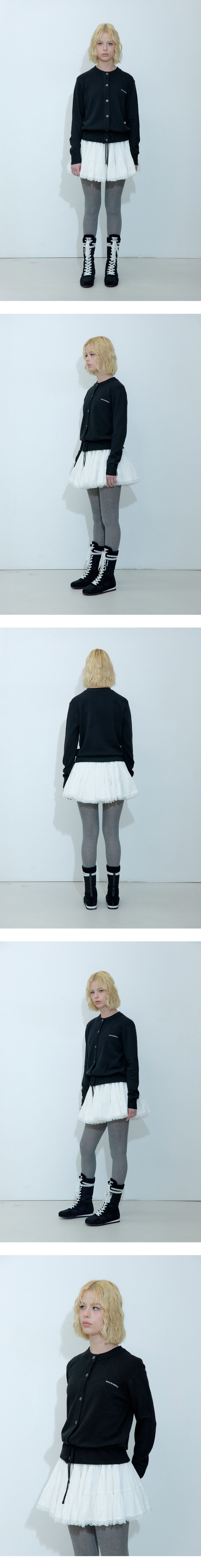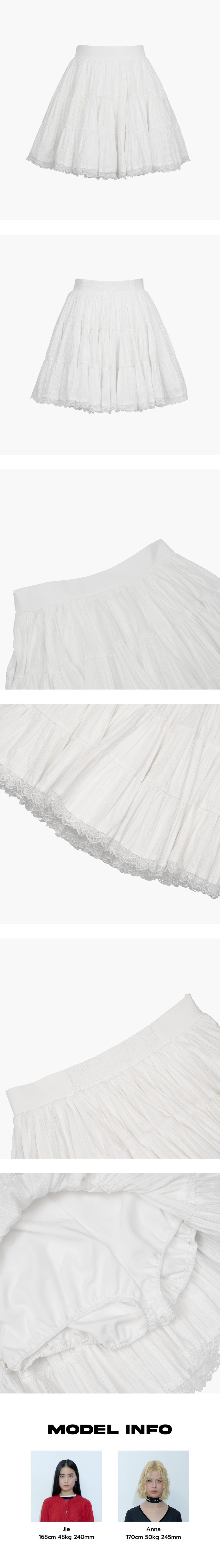 원단을 여러 겹 레이어링하여 제작한 스커트로, 풍성하고 폼폼한 실루엣이 돋보입니다. 안쪽에 속바지가 내장되어 있어 편안하고 실용적이며, 뒷면의 밴딩 처리로 착용감을 더욱 높였습니다. 끝단에는 레이스 디테일을 더해 사랑스러운 매력을 완성했습니다. - Cotton 100% - Model Info : Anna / 170cm / 50kg - Fitting size : S