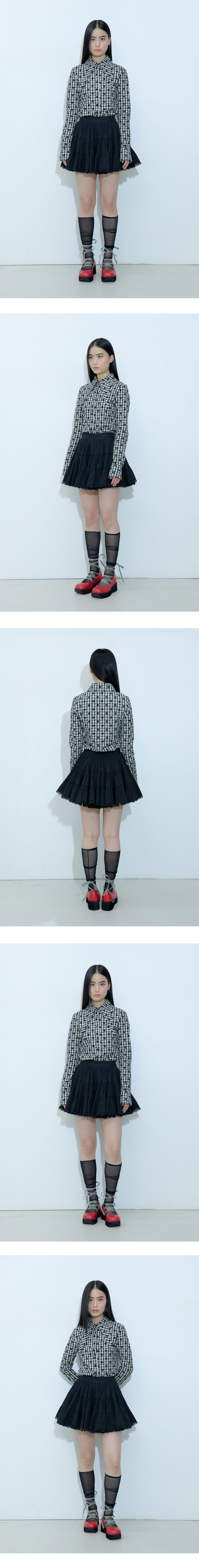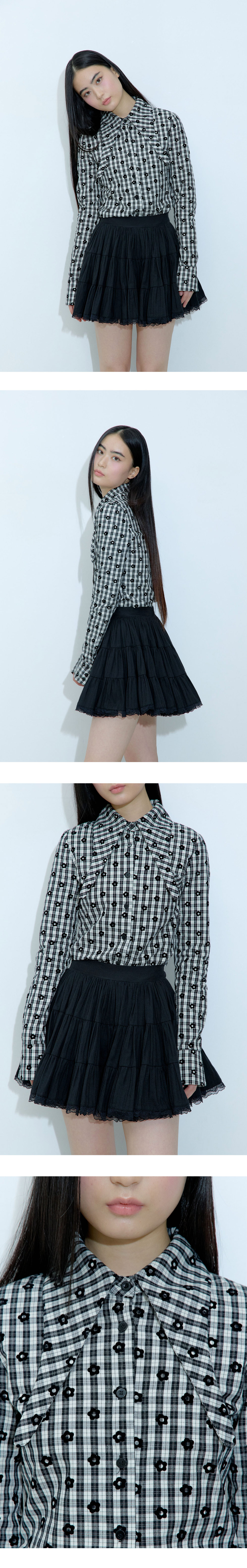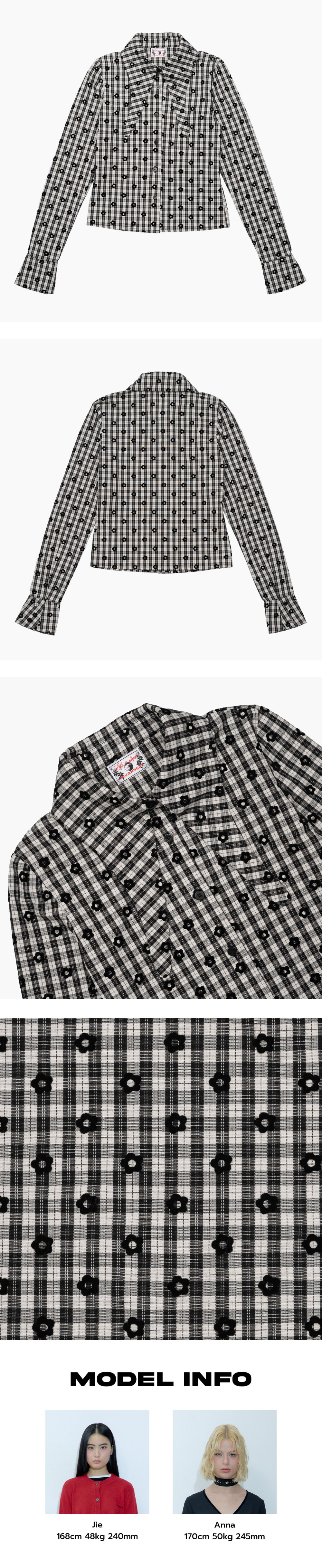 독특한 긴 카라가 스타일에 포인트를 더해주는 셔츠입니다. 체크 패턴 소재에 귀여운 꽃 무늬를 더한 러프넥 자체 제작 원단으로, 탄탄한 면 소재가 실루엣을 예쁘게 잡아줍니다. 소매 끝단은 일반 셔츠보다 약간 더 길고 나팔 형식으로 디자인되어, 자켓이나 가디건과 함께 입었을 때 포인트 스타일링이 가능합니다. - PolyCotton 100% - Model Info :Jie / 168cm / 48kg - Fitting size : S
