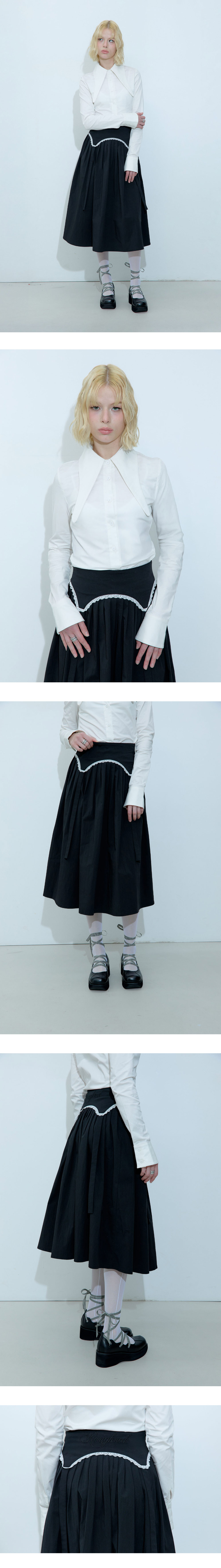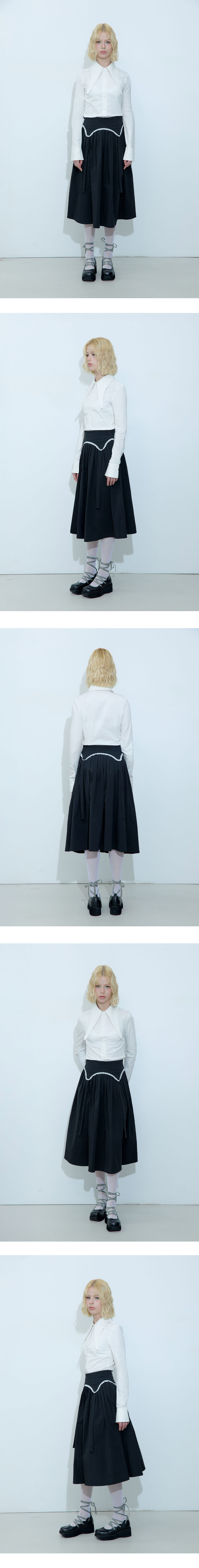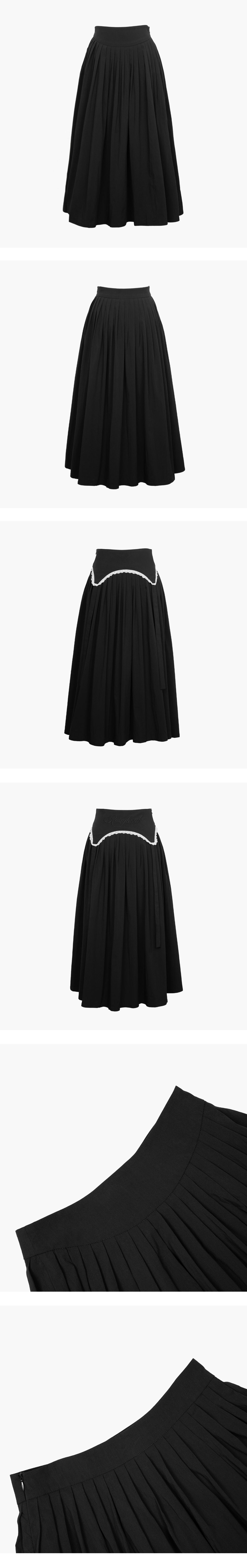 가터 벨트 형식의 장식이 탈부착 가능한 A라인 스커트입니다. 장식을 달면 사랑스러운 무드를 연출할 수 있으며, 장식을 떼면 포멀한 주름 스커트로 착용 가능합니다. 하이웨스트 디자인으로 허리를 예쁘게 잡아주고, 풍성한 A라인 실루엣이 돋보입니다. 가터 장식 뒷면에는 러프넥 자수를 더해 앞뒤 구분 없이 착용할 수 있습니다. - Polyester 55% Nylon 42% Span 3% - Model Info : Anna / 170cm / 50kg - Fitting size : S