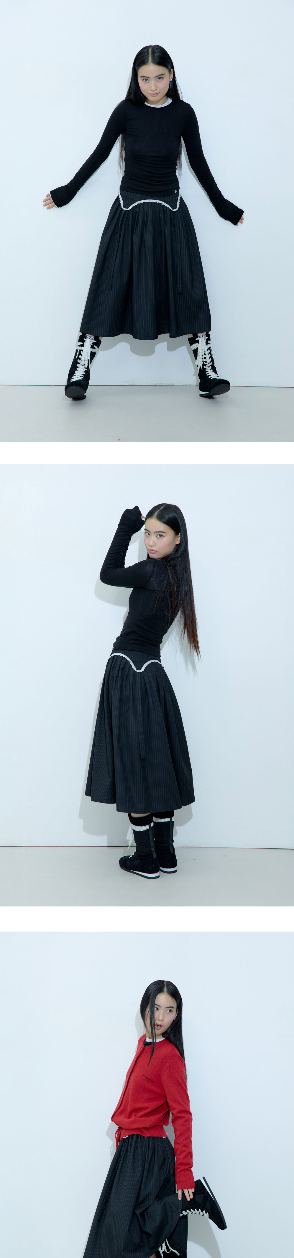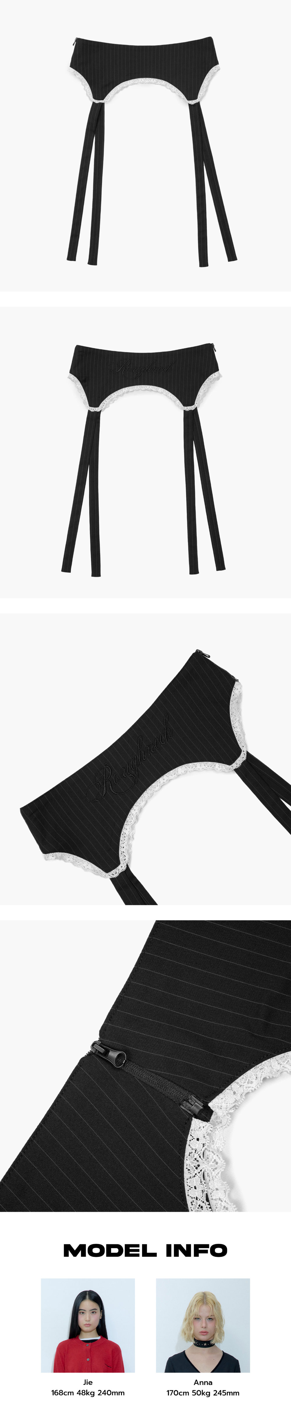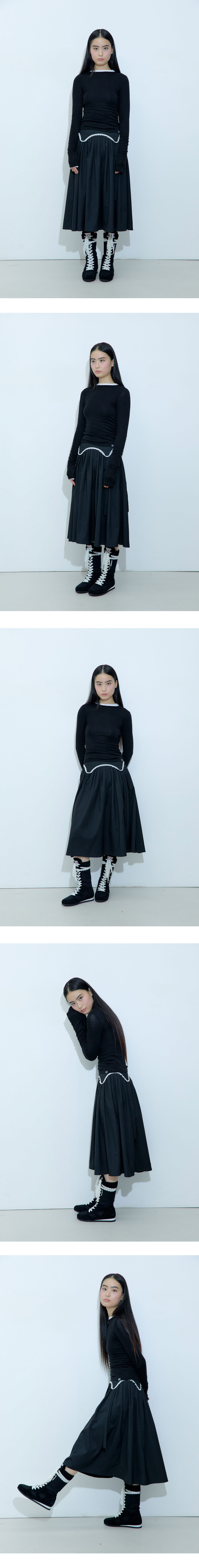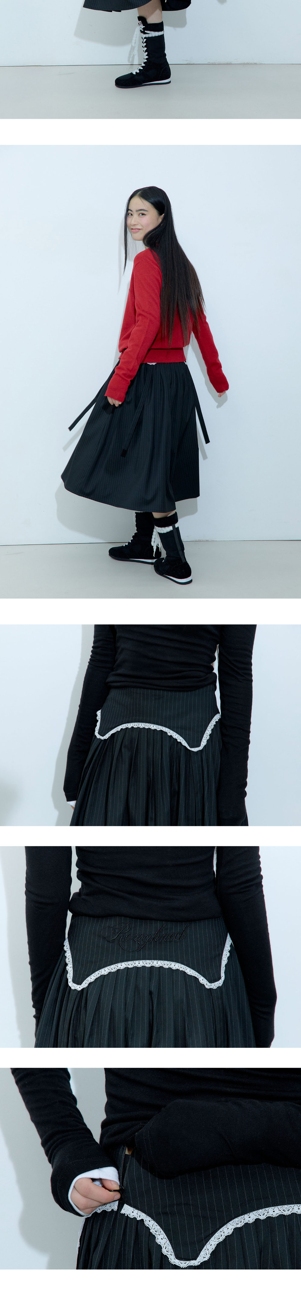 가터 벨트 형식의 장식이 탈부착 가능한 A라인 스커트입니다. 장식을 달면 사랑스러운 무드를 연출할 수 있으며, 장식을 떼면 포멀한 주름 스커트로 착용 가능합니다. 하이웨스트 디자인으로 허리를 예쁘게 잡아주고, 풍성한 A라인 실루엣이 돋보입니다. 가터 장식 뒷면에는 러프넥 자수를 더해 앞뒤 구분 없이 착용할 수 있습니다. - Polyester 68% Rayon 28% Span 4% - Model Info : Jie / 168cm / 48kg - Fitting size : S