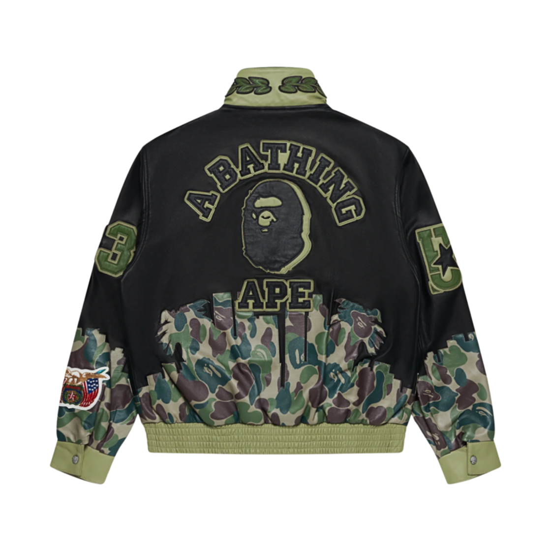 베이프 x 제프 해밀턴 ABC 카모 멀티 로고 패치드 레더 자켓 다크 그린