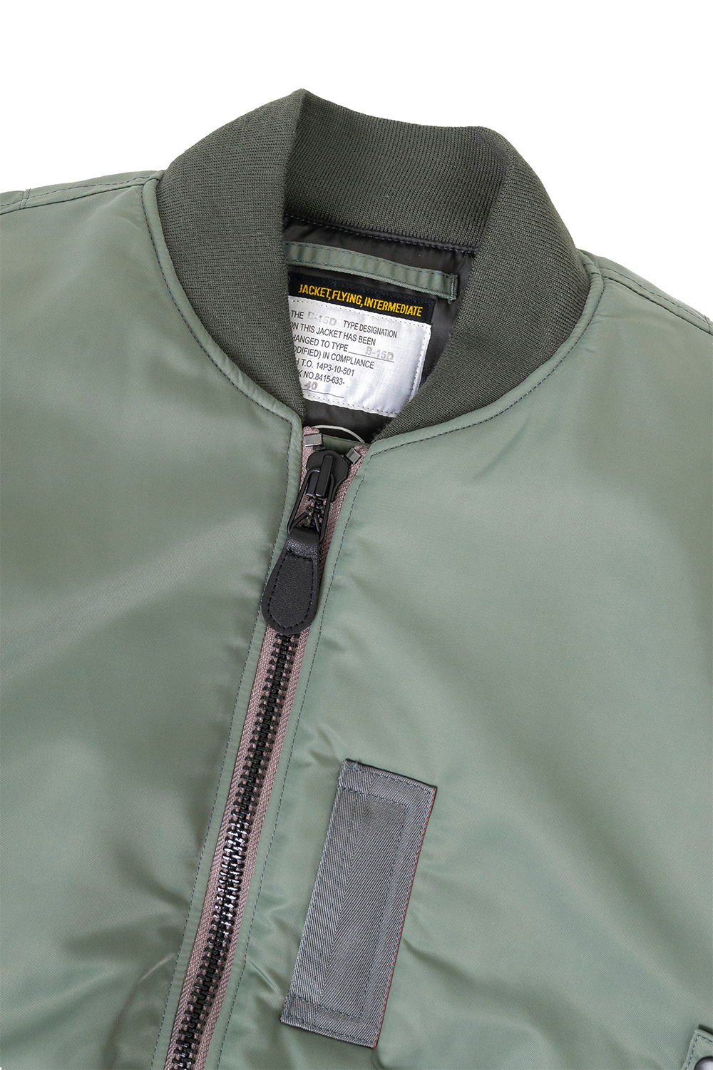 Houston Japan 5006C B-15D Modify Flight Jacket - Sage B-15D Flight Jacket의 무스탕 옷길을 니트로 변경한 제품입니다. MA-1 Flight Jacket과 유사하나 검은 라벨 위에 부착된 흰색 라벨, 옷깃과 옷단의 스티치의 차이가 있습니다. 광택감 있는 헤비 나일론 트윌을 사용하였습니다. * Upper : Nylon 100% * Lining : Polyester 100% * Lib: Acrylic 90% / Wool 10% * Filling : Polyester 100% * 빛에 의한 제품의 색감 차이가 존재 할 수 있습니다. * Made in China