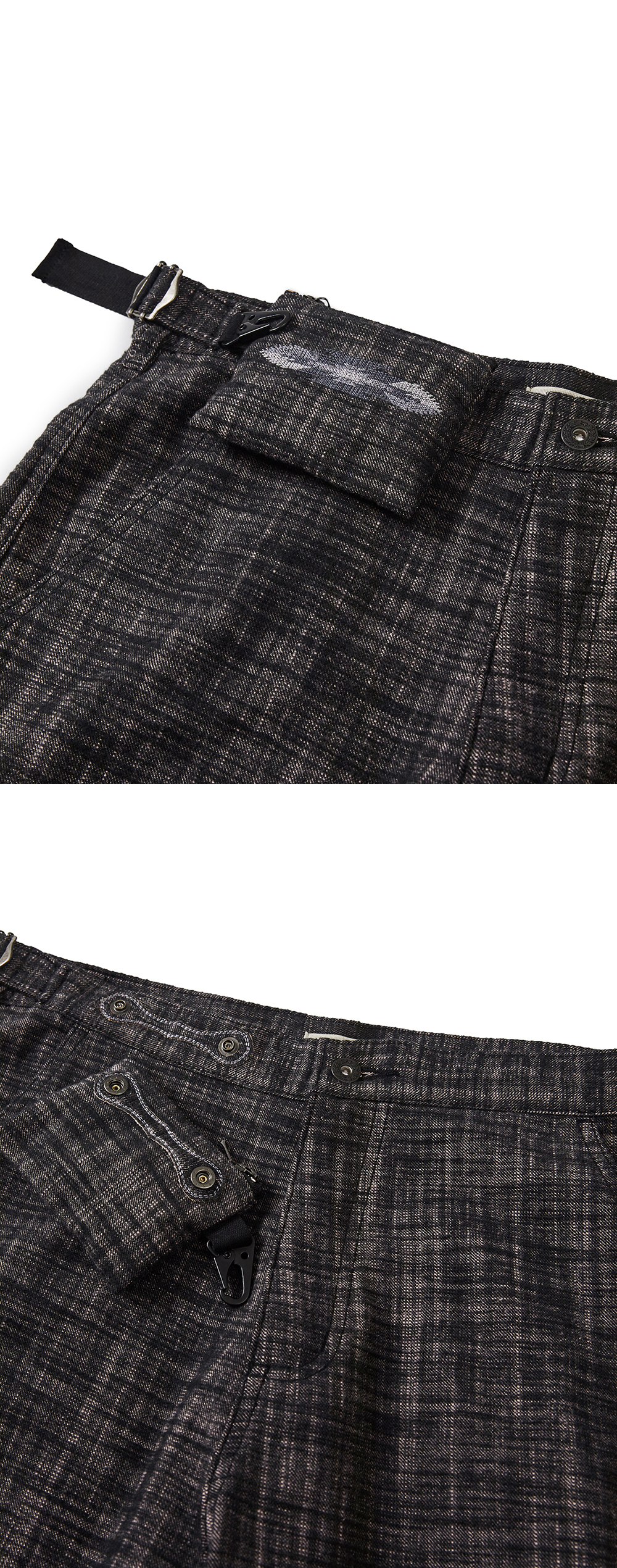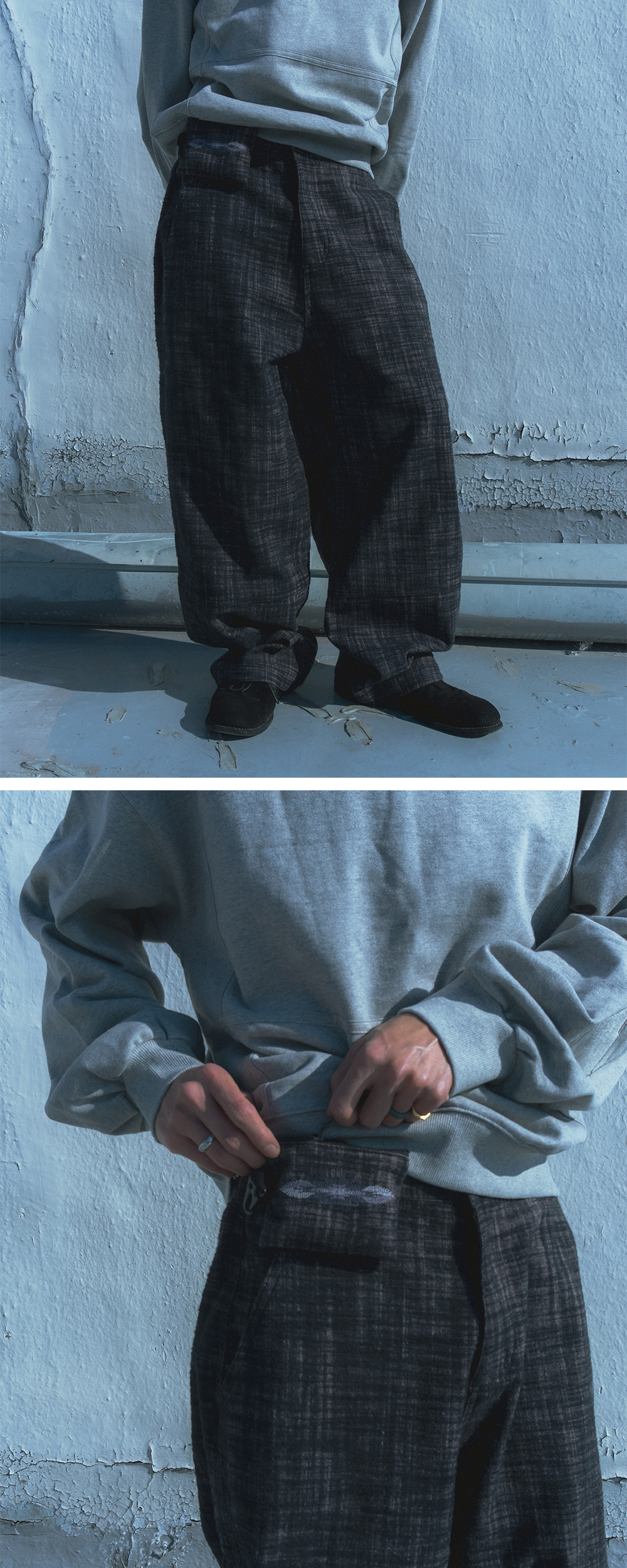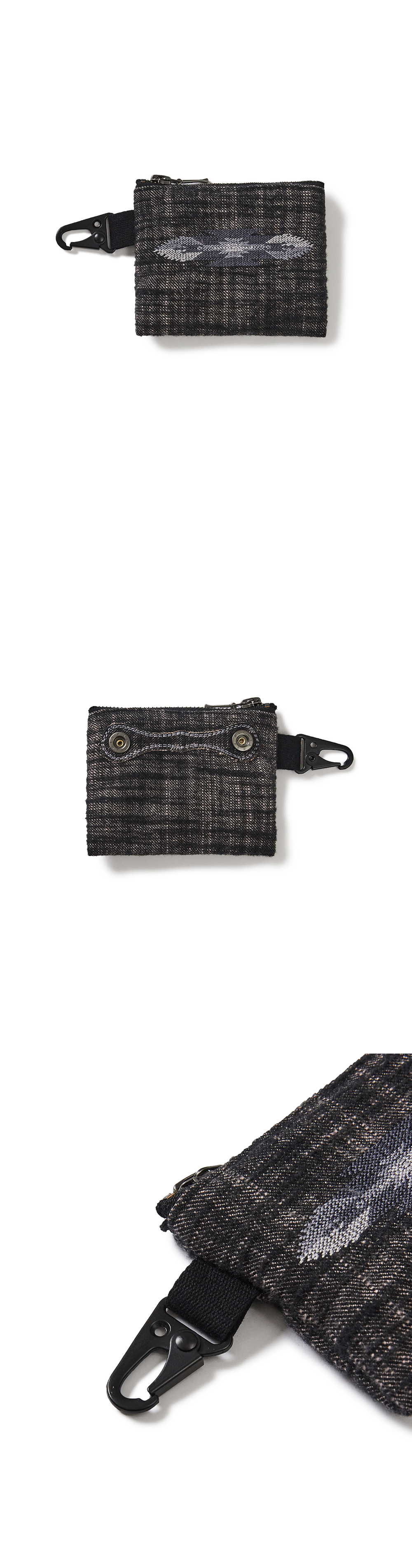 Product Info. - 러프한 슬라브 텍스처로 이루어진 겉면 기모 체크 패턴의 7수 코튼 원단 - 염색 가공을 통해 은은하게 도는 퍼플 컬러가 매력적인 아이템 - 카드 및 에어팟, 코인 수납이 가능한 키링 형태의 파우치 - 빈티지 무드의 패턴 자수와 YKK PERMEX 스냅 포인트 - YKK 지퍼 ※ 'Shaggy check pouch pants'와 동일한 원단으로 제작되었으며, 탈착이 가능합니다. ※