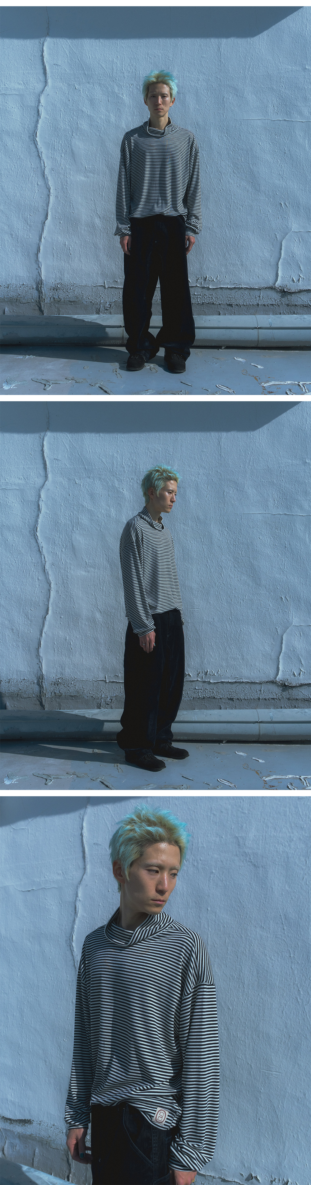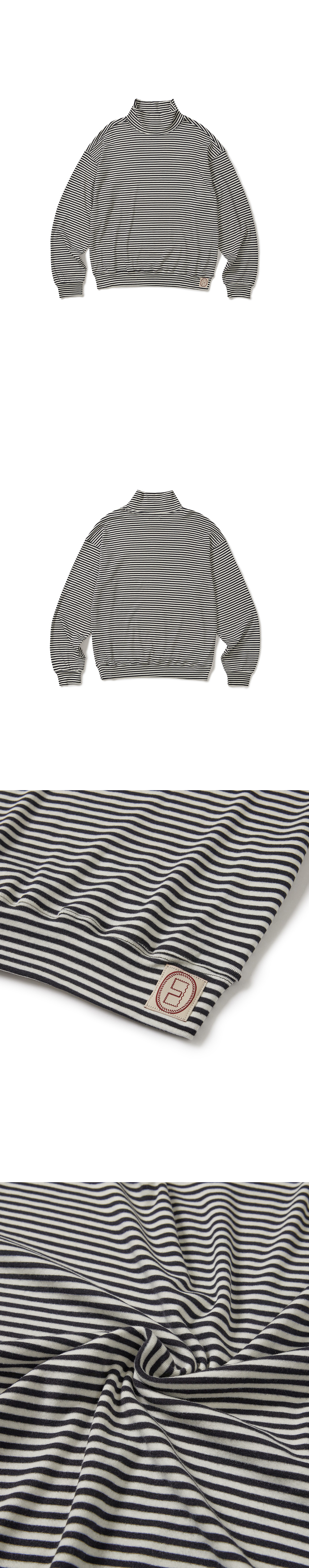 Product Info. - 소프트한 스킨십의 스트라이프 터틀넥 롱 슬리브 - 여유 있게 드레이프 되는 터틀넥 디자인 - 경쾌한 크롭 기장감 - 오버사이즈드 실루엣으로 가볍고 편안한 착용감 - 밑단 사이드 시그니처 로고 라벨 봉제 디테일