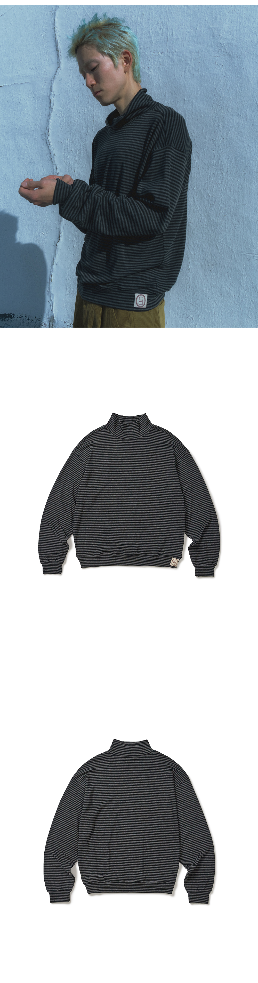 Product Info. - 소프트한 스킨십의 스트라이프 터틀넥 롱 슬리브 - 여유 있게 드레이프 되는 터틀넥 디자인 - 경쾌한 크롭 기장감 - 오버사이즈드 실루엣으로 가볍고 편안한 착용감 - 밑단 사이드 시그니처 로고 라벨 봉제 디테일