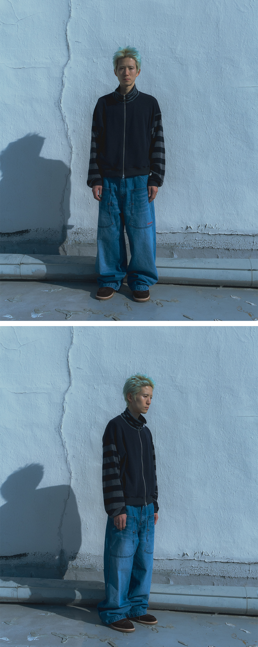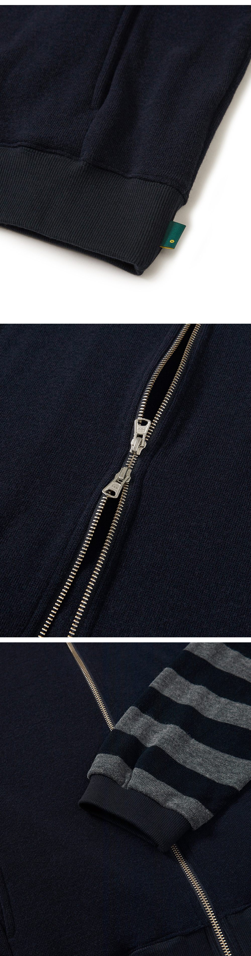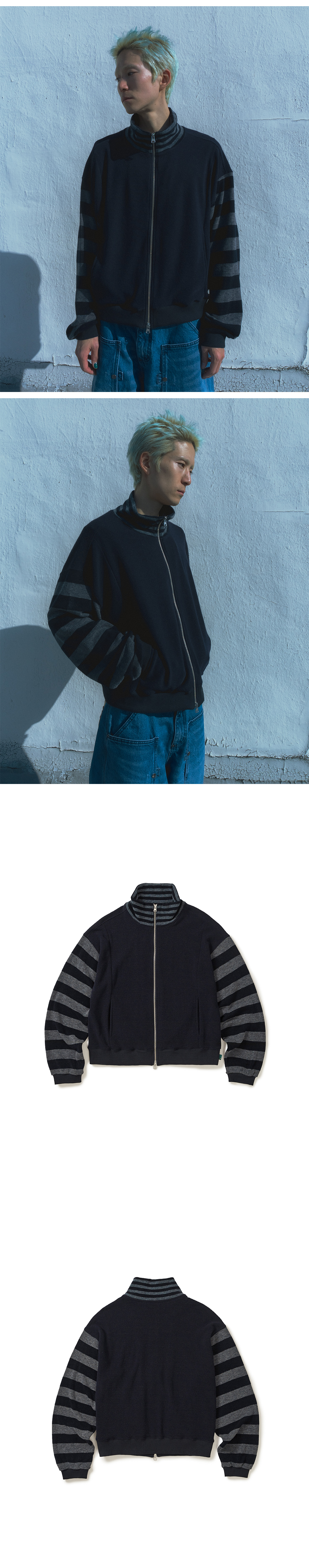 Product Info. - 소프트한 스킨십의 니트 원단으로 제작된 하이넥 집업 자켓 - 간절기 단독 착용 및 겨울철 이너로 적합한 소재감 - 여유 있는 실루엣과 경쾌한 기장감 - 감각적인 스트라이프와 솔리드 패브릭 컬러 블럭 디자인 - 전면 양쪽 절개 포켓 구조 - 절개 갈라 삼봉과 시접 바인딩 마감으로 견고한 봉제 완성도 - 전면 YKK 2-WAY 지퍼로 다양한 연출 가능