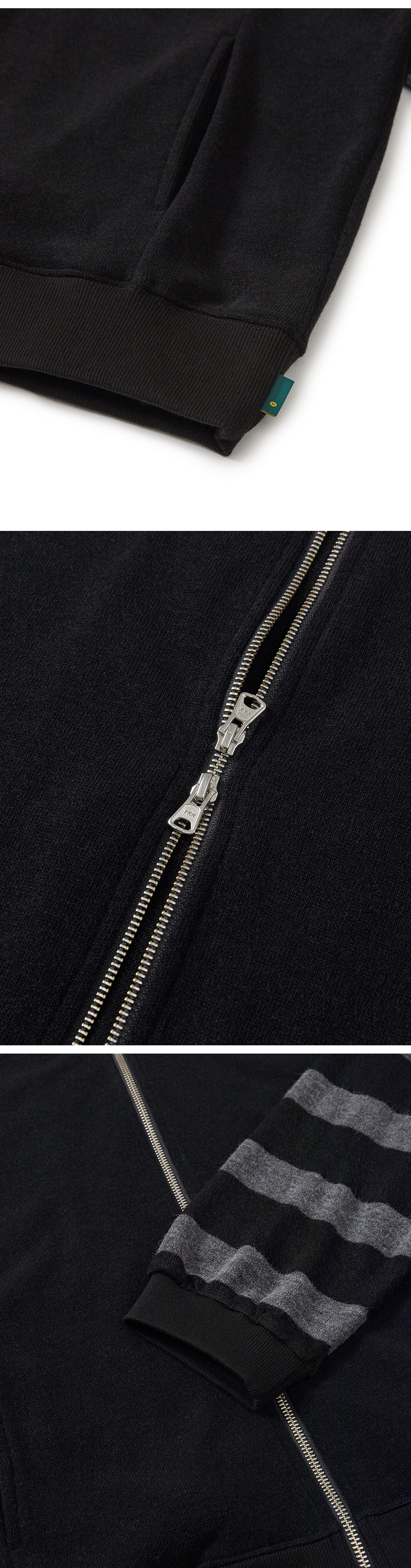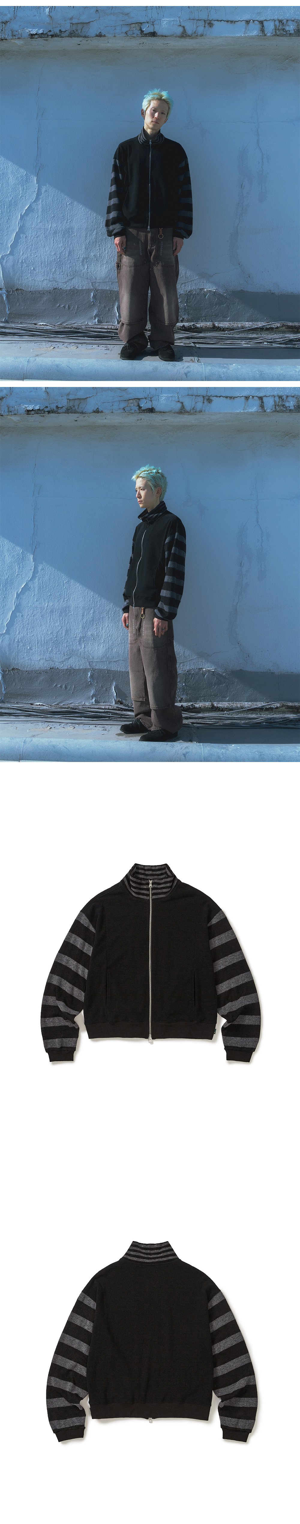 Product Info. - 소프트한 스킨십의 니트 원단으로 제작된 하이넥 집업 자켓 - 간절기 단독 착용 및 겨울철 이너로 적합한 소재감 - 여유 있는 실루엣과 경쾌한 기장감 - 감각적인 스트라이프와 솔리드 패브릭 컬러 블럭 디자인 - 전면 양쪽 절개 포켓 구조 - 절개 갈라 삼봉과 시접 바인딩 마감으로 견고한 봉제 완성도 - 전면 YKK 2-WAY 지퍼로 다양한 연출 가능