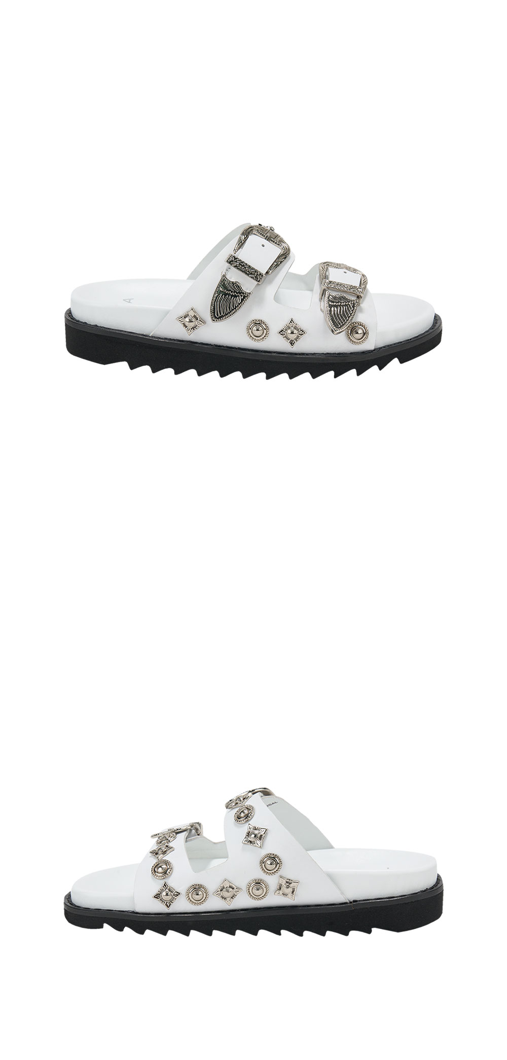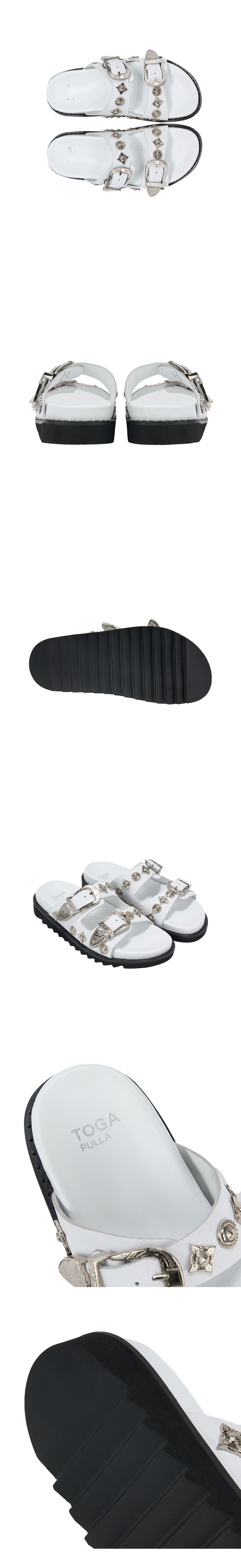 옆면까지 이어진 어퍼의 메탈 스터드가 웨스턴 분위기를 자아내는 토가의 풀라 AJ844 레더입니다. - 두께가 있는 샤크 솔 - 부드러운 깔창 - 사이즈 조정 가능한 버클 - 힐 2.5cm