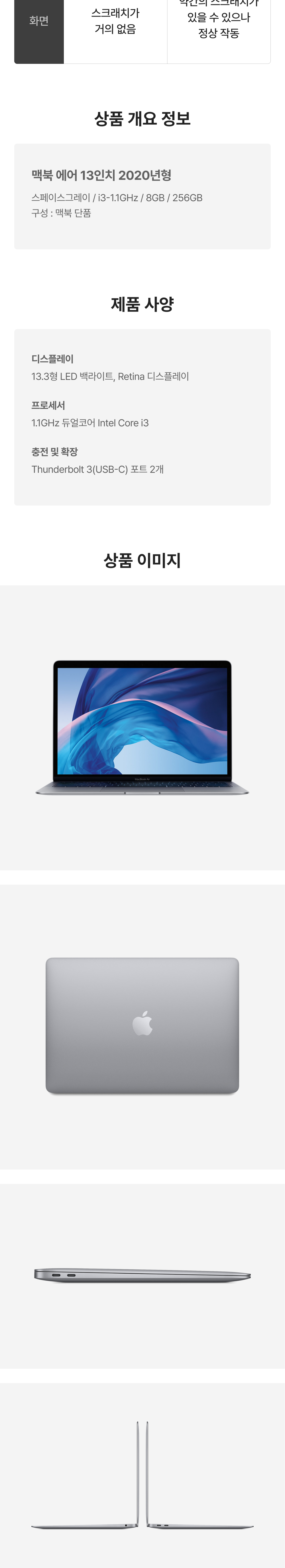 [S등급] 리퍼비시 2020 맥북 에어 13 i3-1.1GHz 256기가 SSD 8기가 램 스페이스그레이