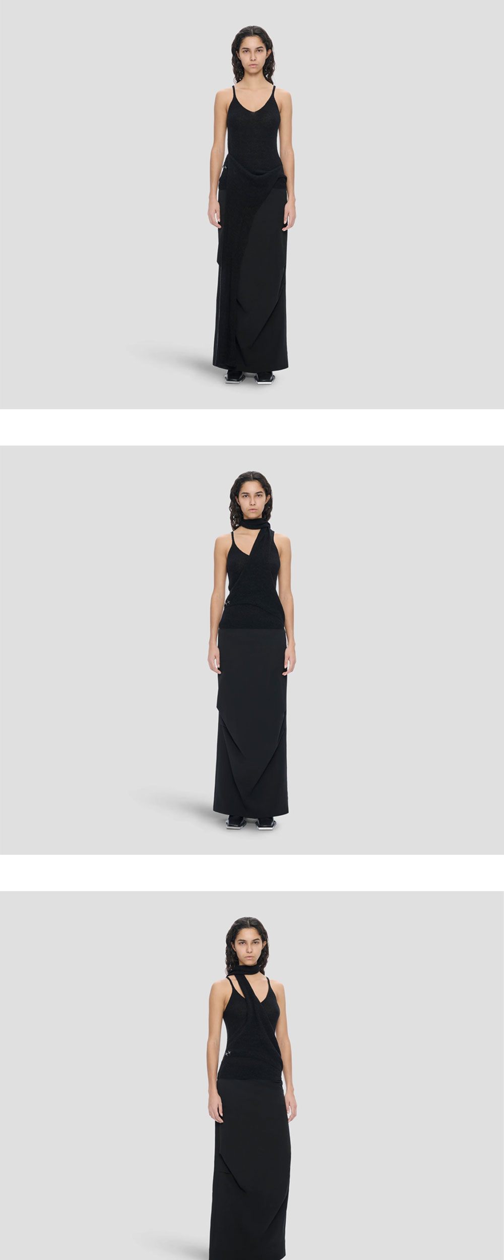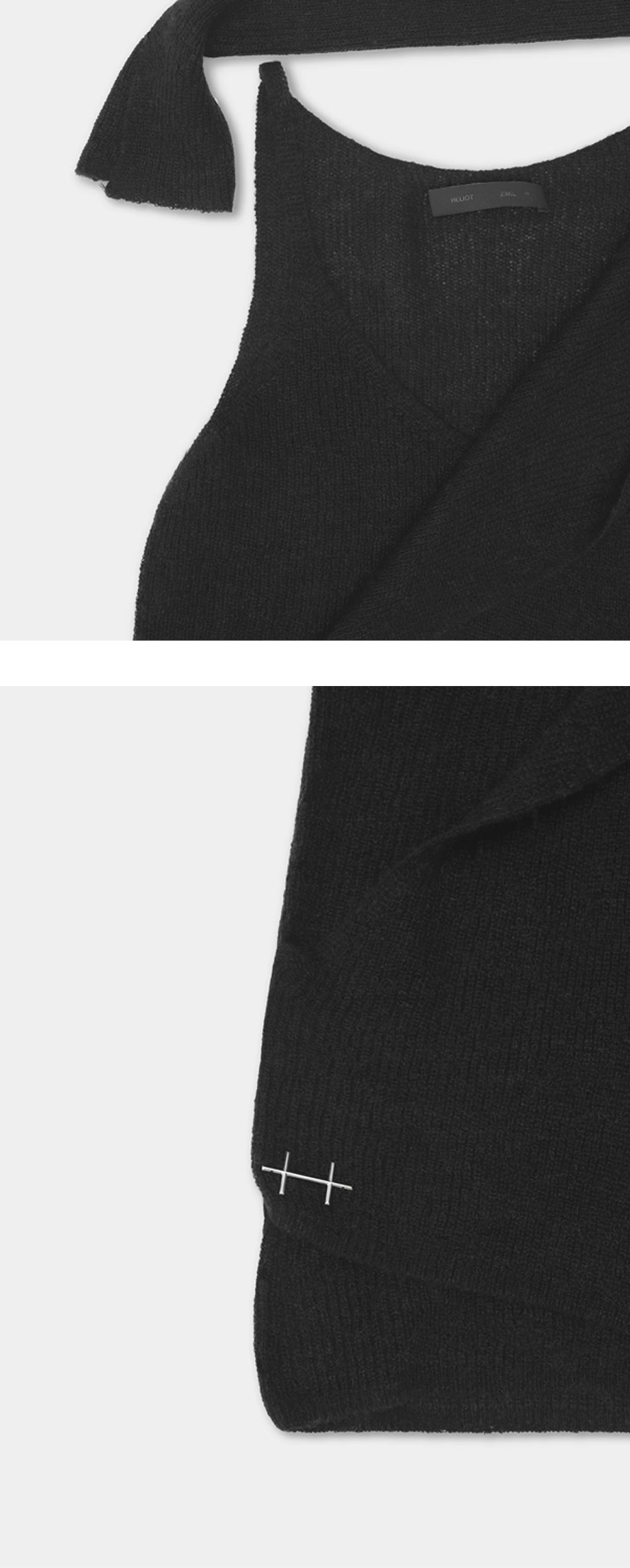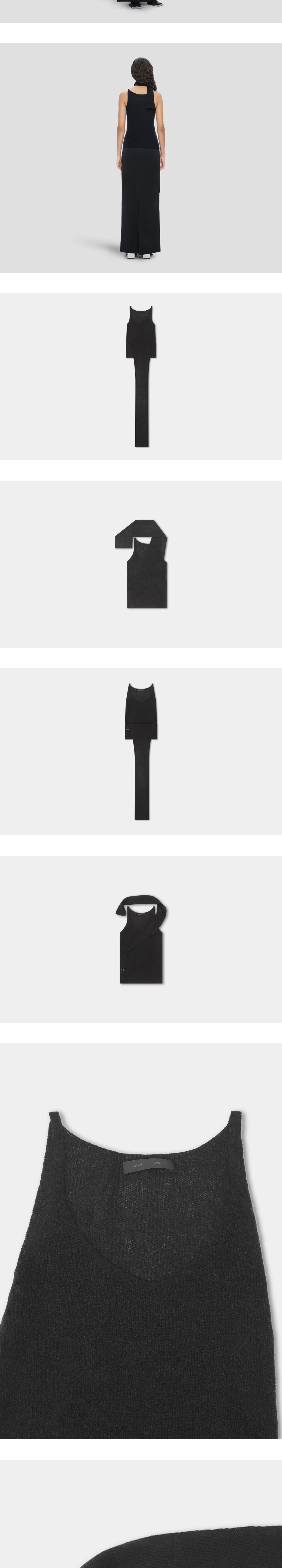 롱 스카프 레이어드 형식이 유니크한 엘리엇 에밀의 에스츄어리 탑 블랙 컬러입니다. -더블 레이어 오픈 니트 탑 -롱 스카프 형태로 디자인되어 다양한 스타일링 가능 -슬림 핏 -사이드 심에 고정된 스카프 레이어가 있는 베이스 레이어 구조 -오픈 니트 짜임 -알파카와 메리노 울 혼방 소재