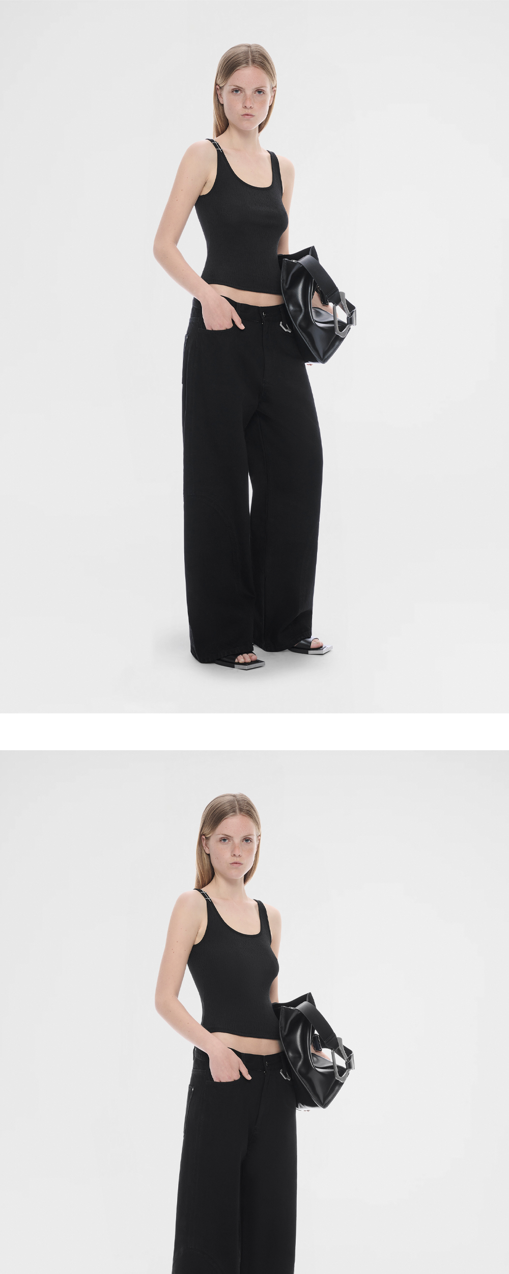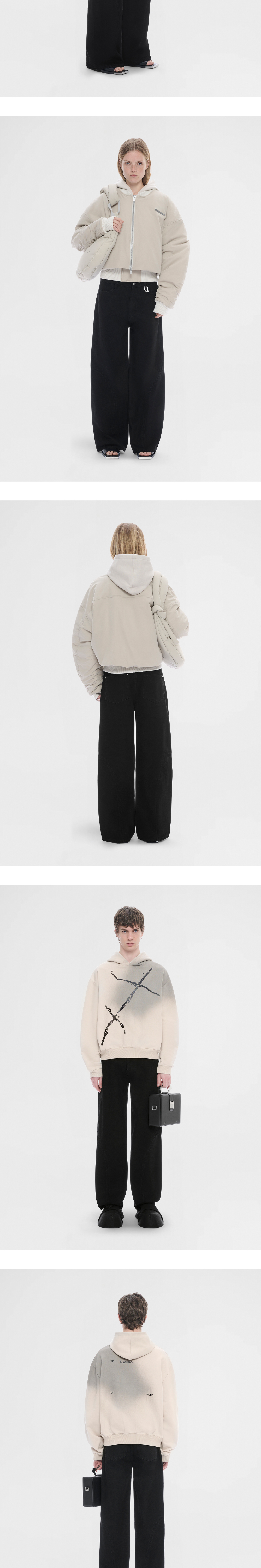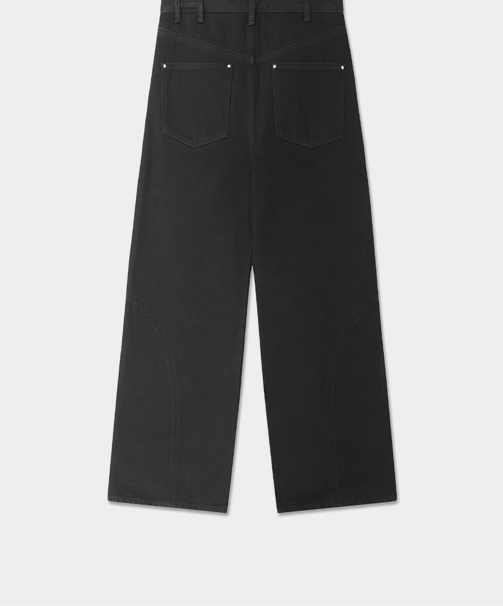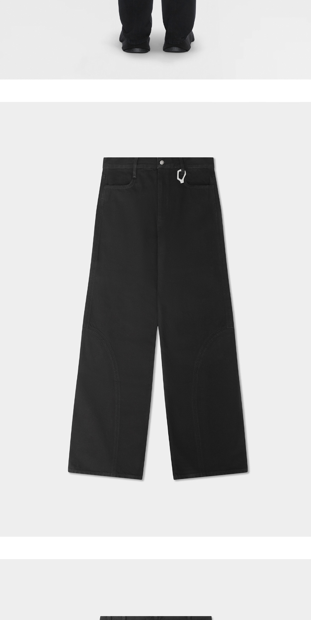 밋밋하지 않게 허리 고리로 포인트를 준 엘리엇 에밀의 버설트 데님 블랙입니다. - 유니섹스 핏 - 절개 라인 포인트 - 두 개의 엉덩이 포켓