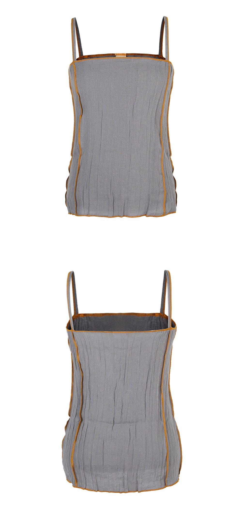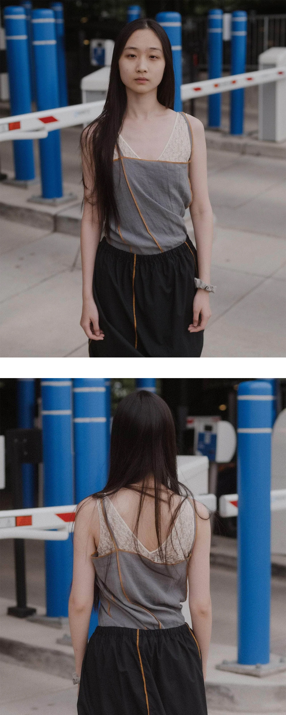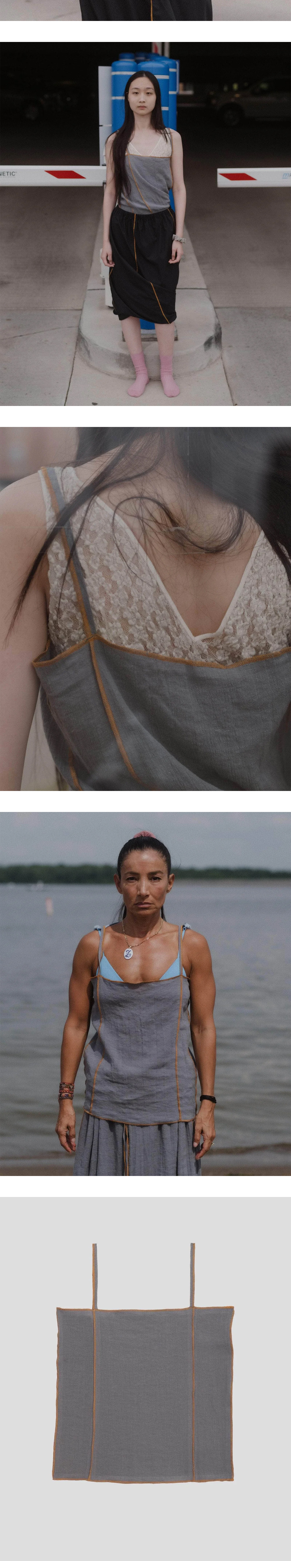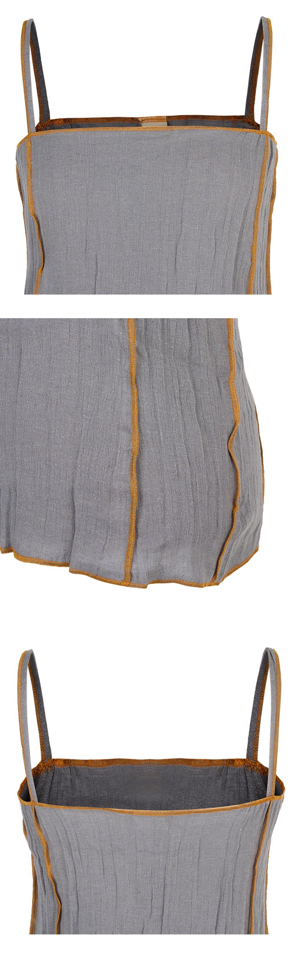 그레이 색상에 포인트 옐로우 라인을 첨가한 베이스레인지의 쇼크 슬립 탑입니다. - 크링클 린넨 탑 - 노출된 대조 솔기 스트레이트 넥 - 얇은 어깨끈 * 모델 S 사이즈 착용