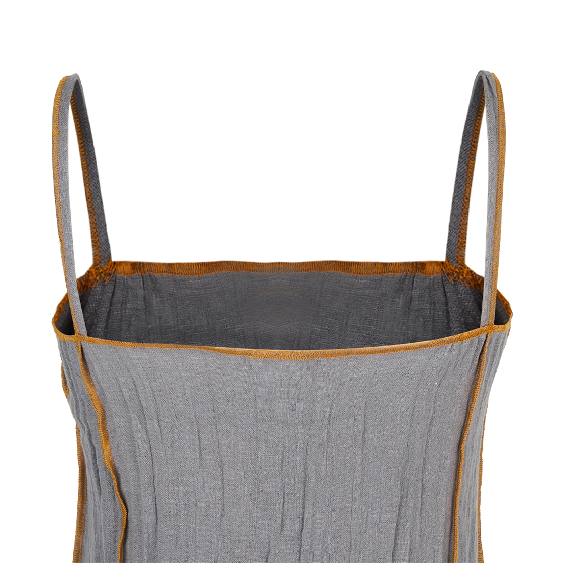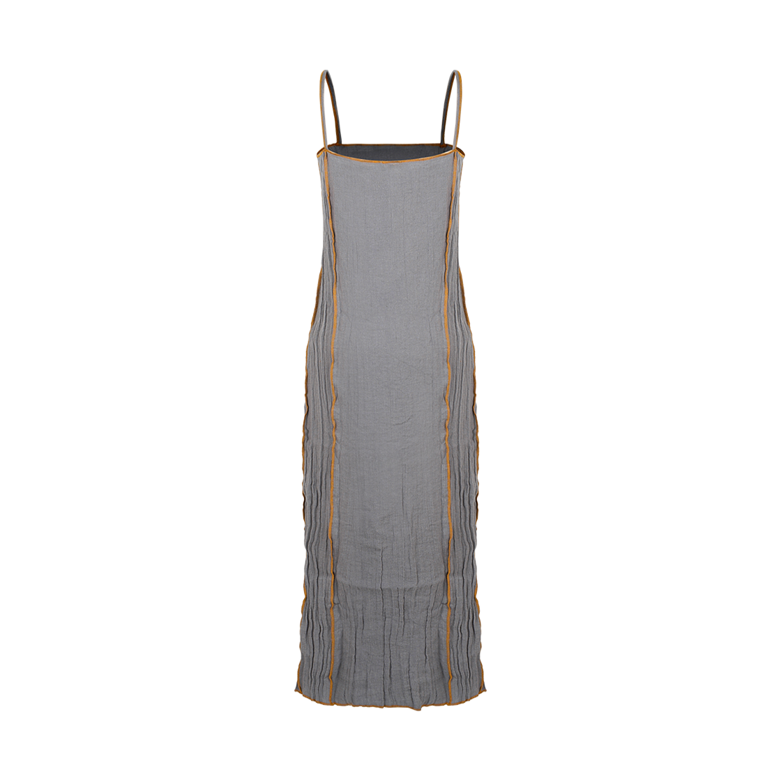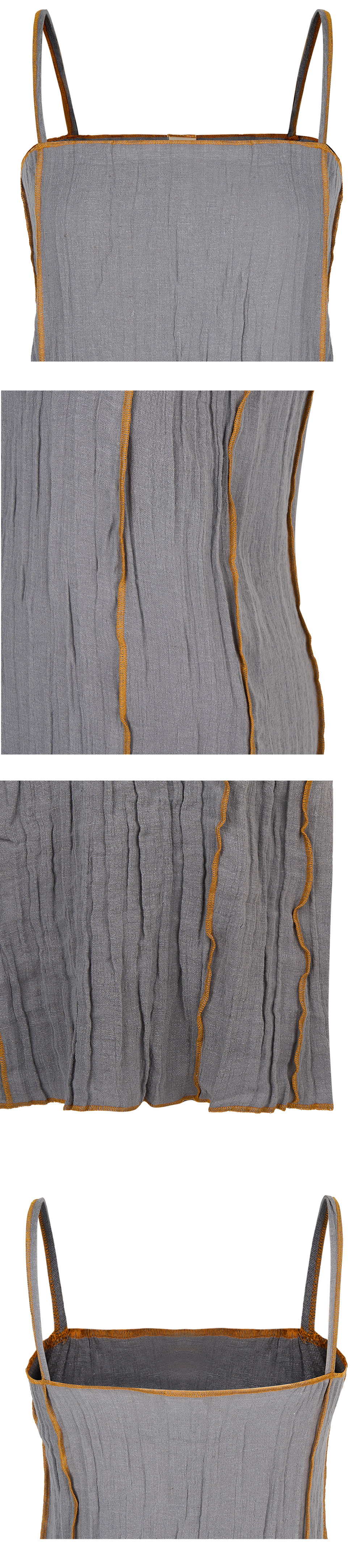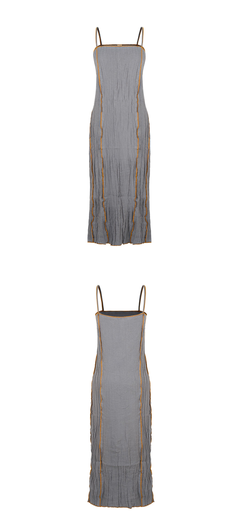그레이 컬러에 옐로우 포인트 라인이 배색된 베이스레인지의 쇼크 슬립 드레스입니다. - 크링클 린넨 슬립 드레스 - 얇은 어깨끈 - 노출된 솔기 스트레이트 넥라인 * 모델 S 사이즈 착용