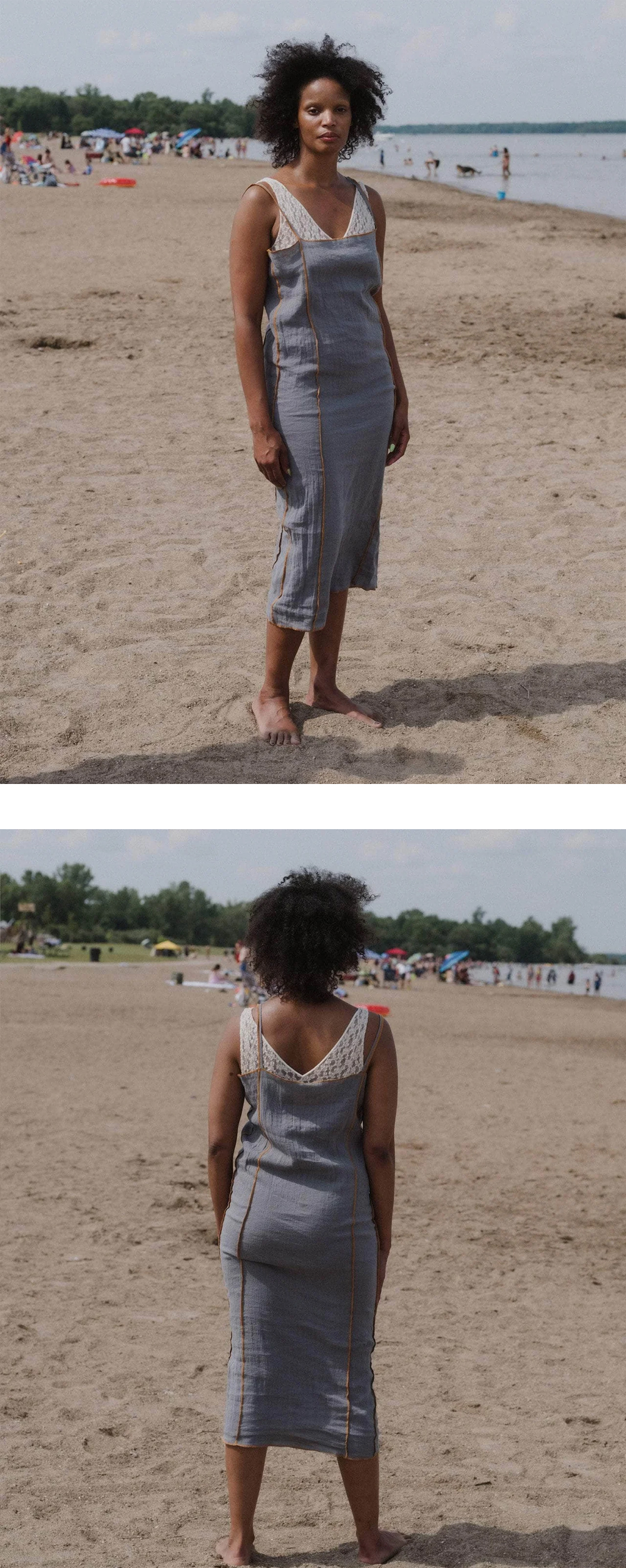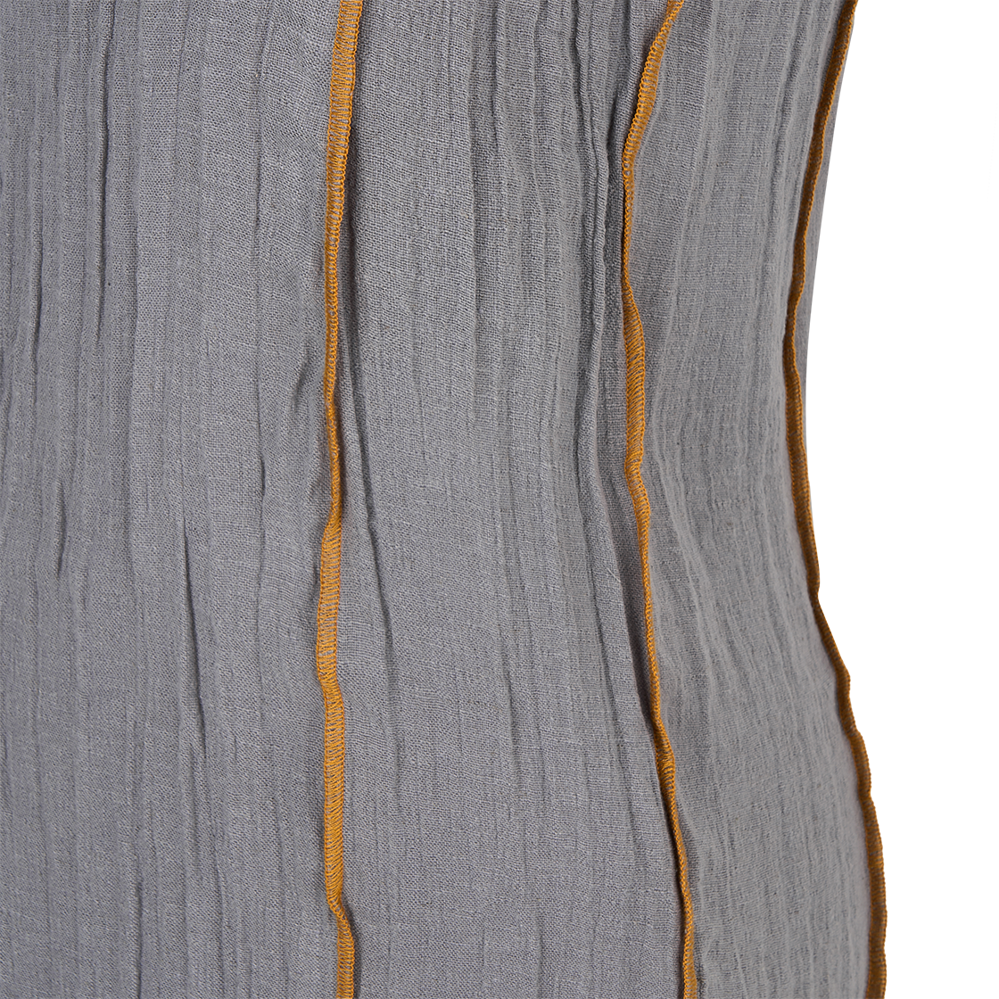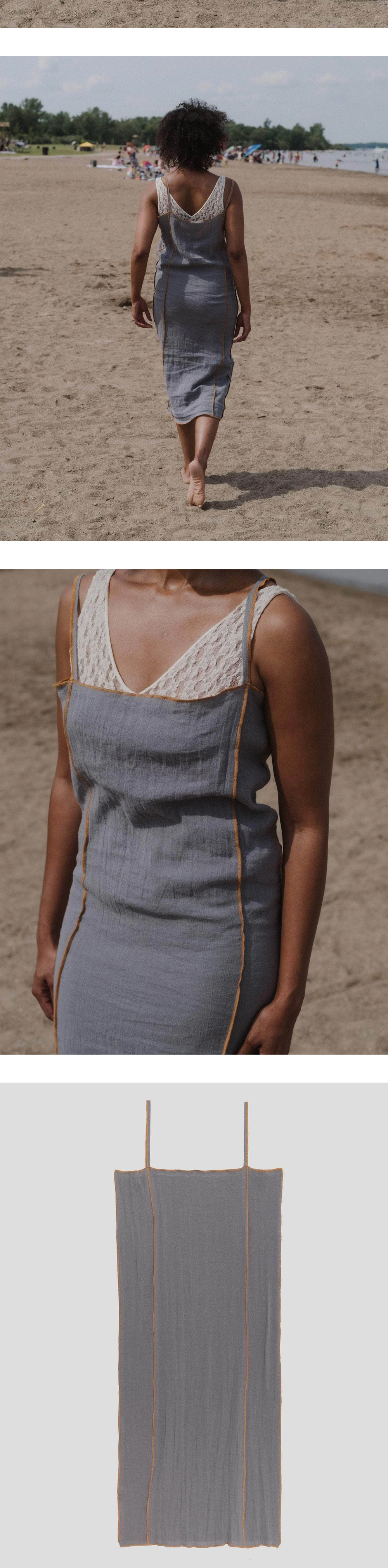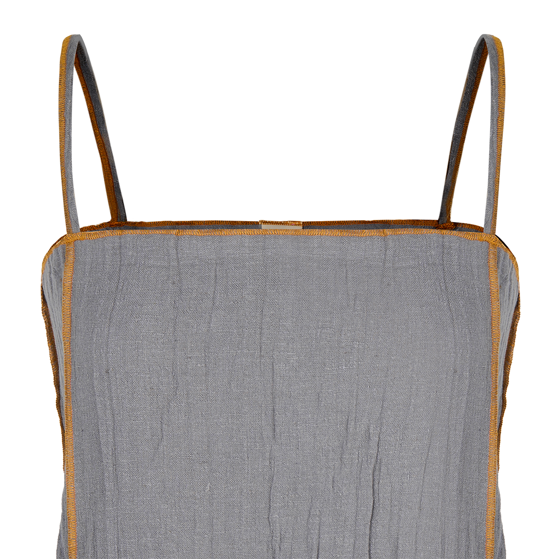그레이 컬러에 옐로우 포인트 라인이 배색된 베이스레인지의 쇼크 슬립 드레스입니다. - 크링클 린넨 슬립 드레스 - 얇은 어깨끈 - 노출된 솔기 스트레이트 넥라인 * 모델 S 사이즈 착용
