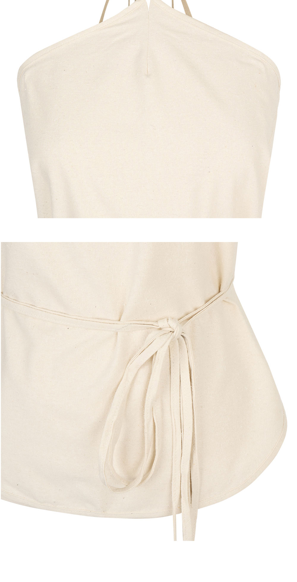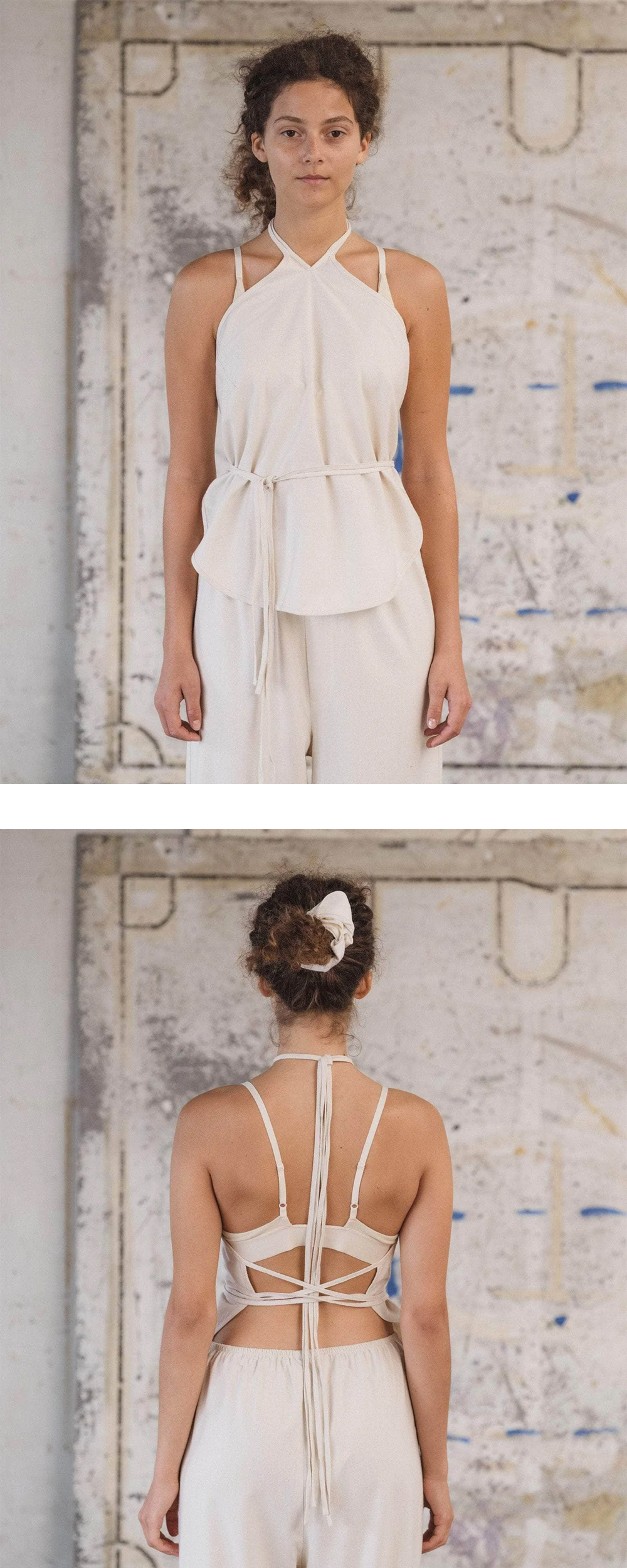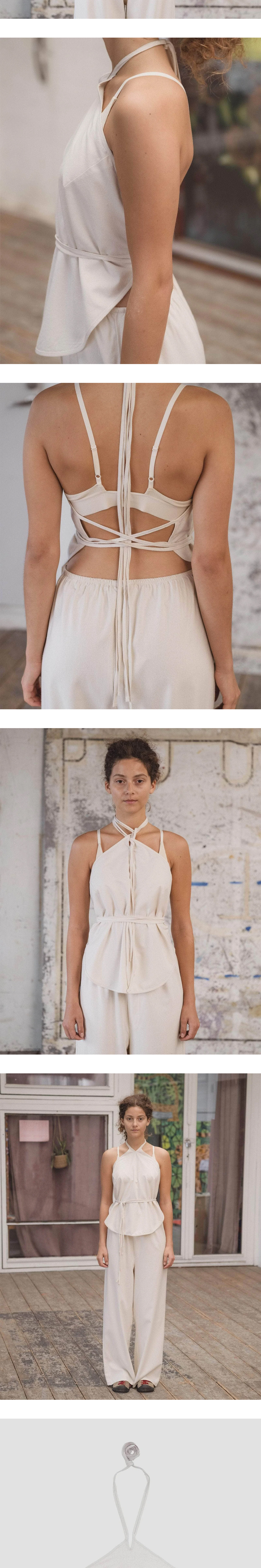 오픈백 홀터넥 포인트로 가벼운 착용감을 자랑하는 베이스레인지의 말 탑 언다이드입니다. - 와일드 실크 랩 탑 - 목과 허리에 타이 - 오픈백, 홀터넥 * 모델 스펙: 172cm, S 사이즈 착용