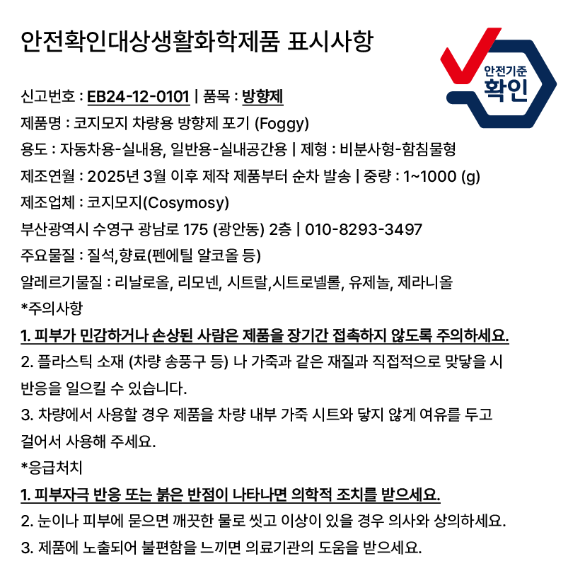 플라스틱 소재 (차량 송풍구 등) 나 가죽과 같은 재질과 직접적으로 맞닿을 시 반응을 일으킬 수 있습니다.