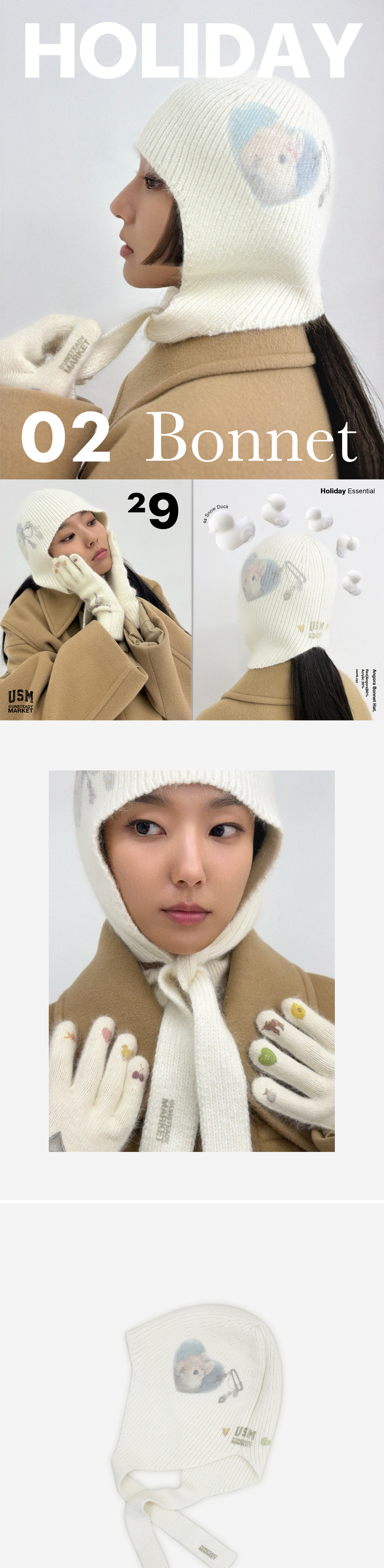 언스테디마켓 홀리데이시즌 한정 앙고라 보닛 바라클라바 제품입니다. *사이즈 머리둘레60cm * 높이26cm [끈길이28cm] 남녀공용. Angora[Rex] 80% Arcylic 20% Made in Korea.